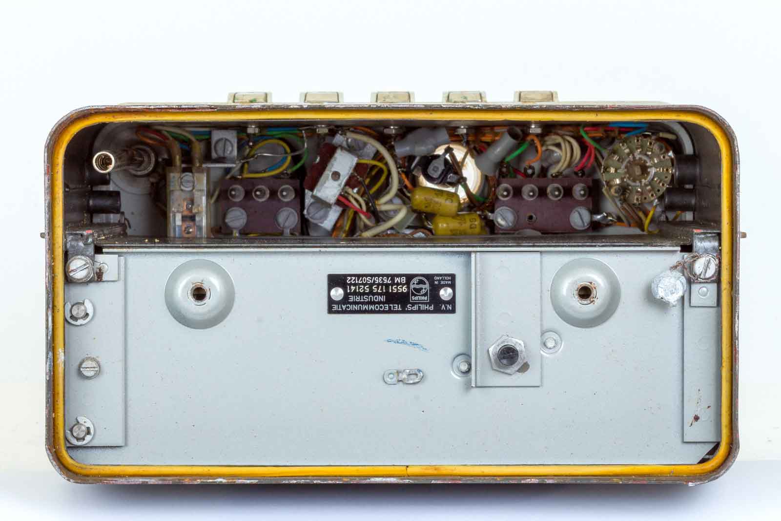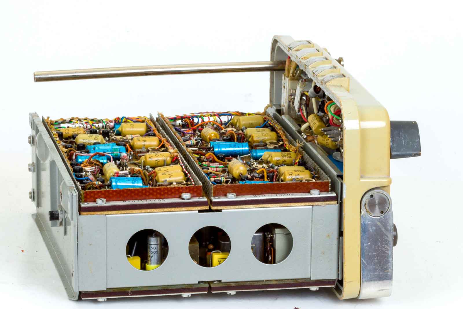 Zijaanzicht met een gedeeltelijk uitgeschoven antenne. Het huis is van een niet al te dik blik. Het front is van kunststof dat door de UV-inwerking wat verkleurd is.