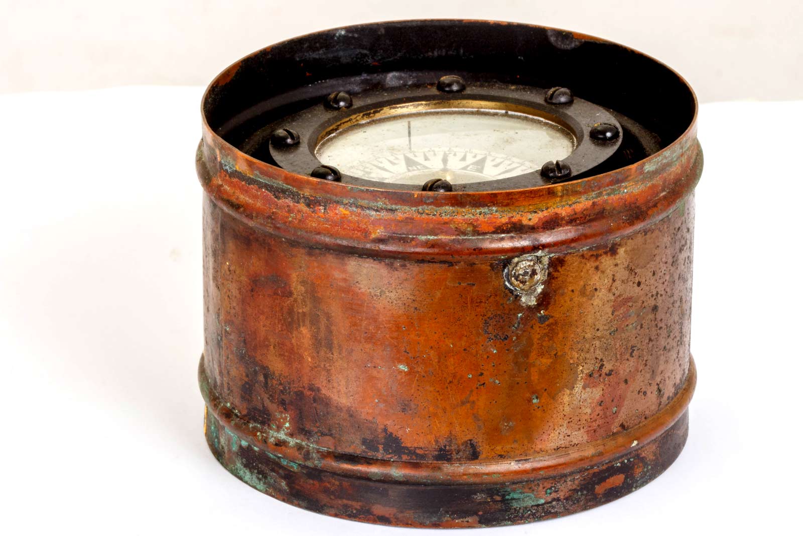 Dan nog een Amerikaans kompas, van de handelsvloot en gebruikt op kleinere schepen en reddings boten. Het ding zat in een koperen bus en wanneer je de deksel er af haalde kon je het kompas aflezen. Omdat het nog al eens onrustig kan zijn op de golven van de oceanen is het binnen door een X-as en een Y-as kantelbaar, zodat hij onder de meeste omstandigheden horizontaal blijft hangen.