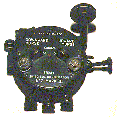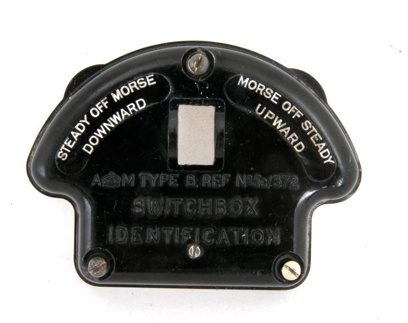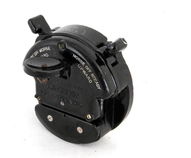 naar een in zichtafstand vliegende bommenwerper seinen door met de seinsleutel het licht van de onderste of bovenste lamp te schakelen.