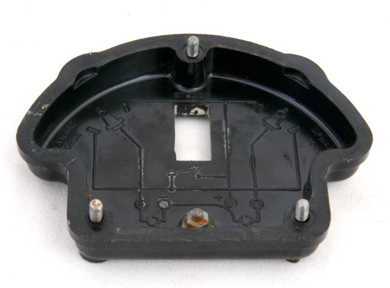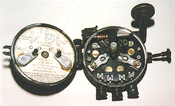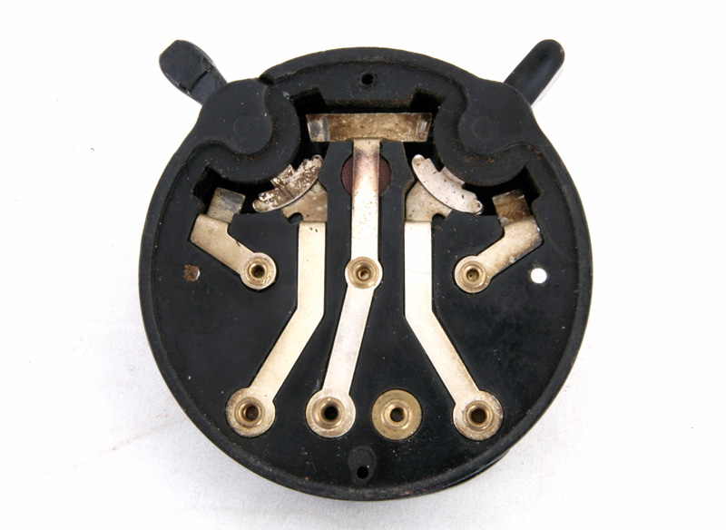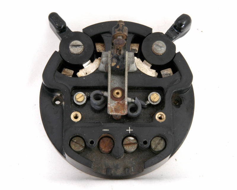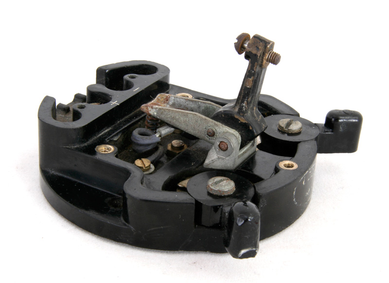 Vooraanzicht van de switchbox. Het kleine schroefje in het midden is voor de instelling van de spleet van de seinsleutel.