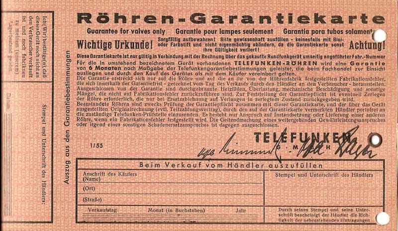 Een extra garantiebewijs voor de buizen van Telefunken.