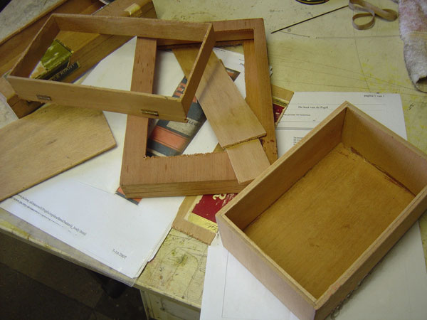 Naar een sigarenzaak gegaan, het geheel uitgelegd en met een paar kistjes naar huis. Aangezien de plankjes van sigarenkistjes nogal dun zijn dubbel uitgevoerd tot ca 8 mm dikte. Geheel gelijmd met 10 sec. lijm. (ja weet het hadden ze toen nog niet maar ik had geen geduld om het met witte houtlijm te doen. Of te spijkeren. Welnu de foto’s spreken voor zich over de bouwwijze. Tekstplaatjes met Pupil erop had Jan nog liggen. Die heb ik dus van hem gekregen. Waarvoor mijn hartelijke dank Jan!!.