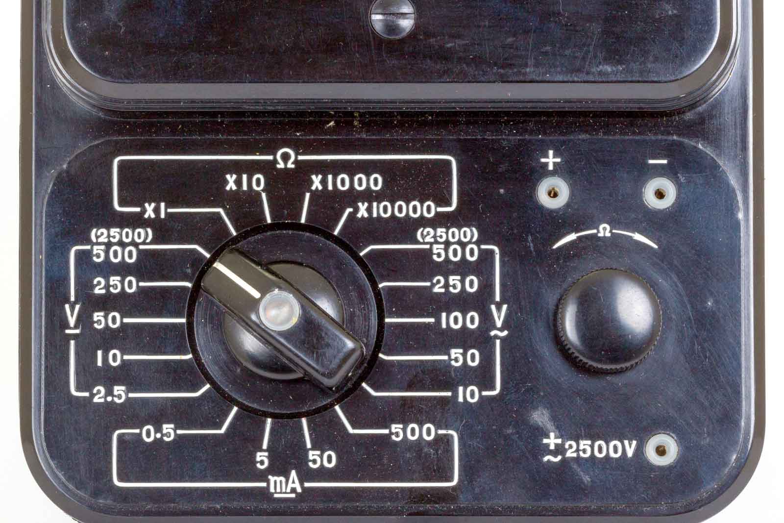 Onder de "nul"-instelling van de draaispoel-meter het bedieningsveld. De bereiken zijn duidelijk aangegeven. Voor alle normale metingen de twee bussen boven de Ohm-instellingsknop. Bij metingen boven 500 Volt de min-bus en de 2500 V bus gebruiken.