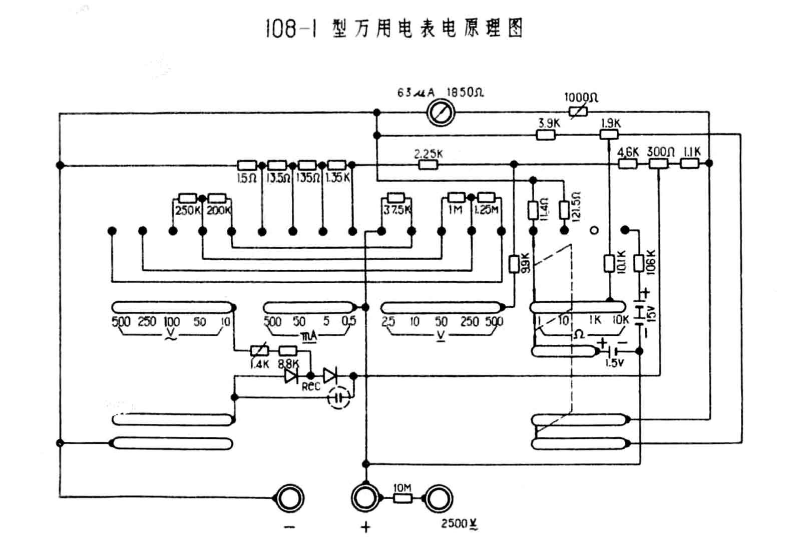 Het weerstandsbereik van X1 t/m X1000 werkt met een 1,5 Voltbatterij en dat van X10000 met 15 Volt batterij.