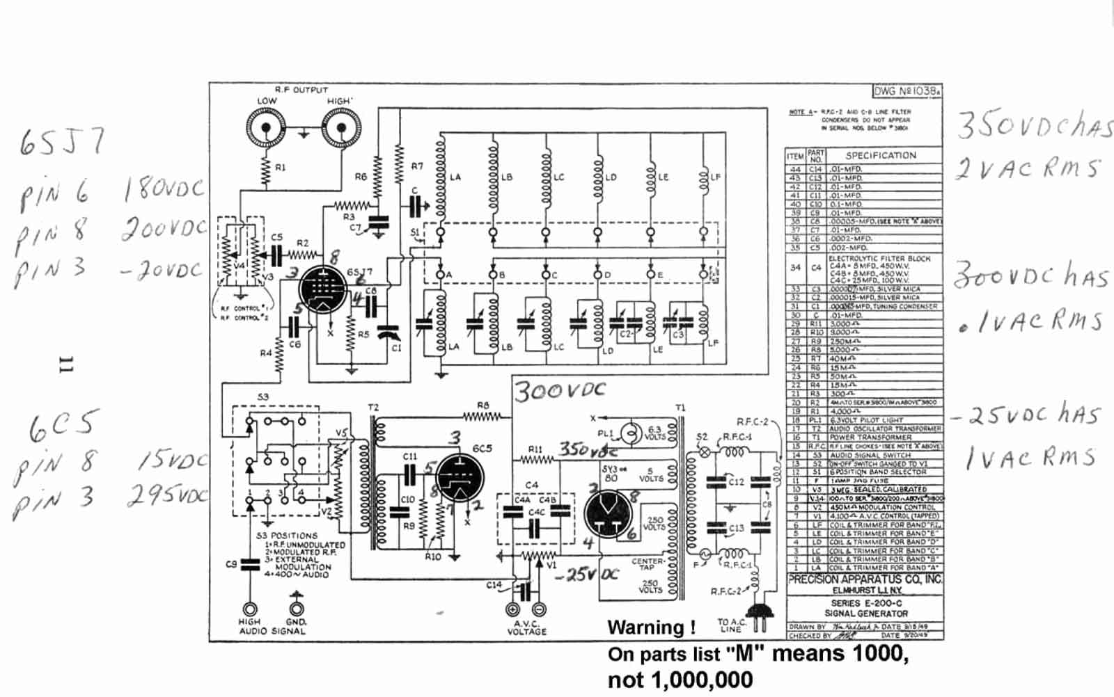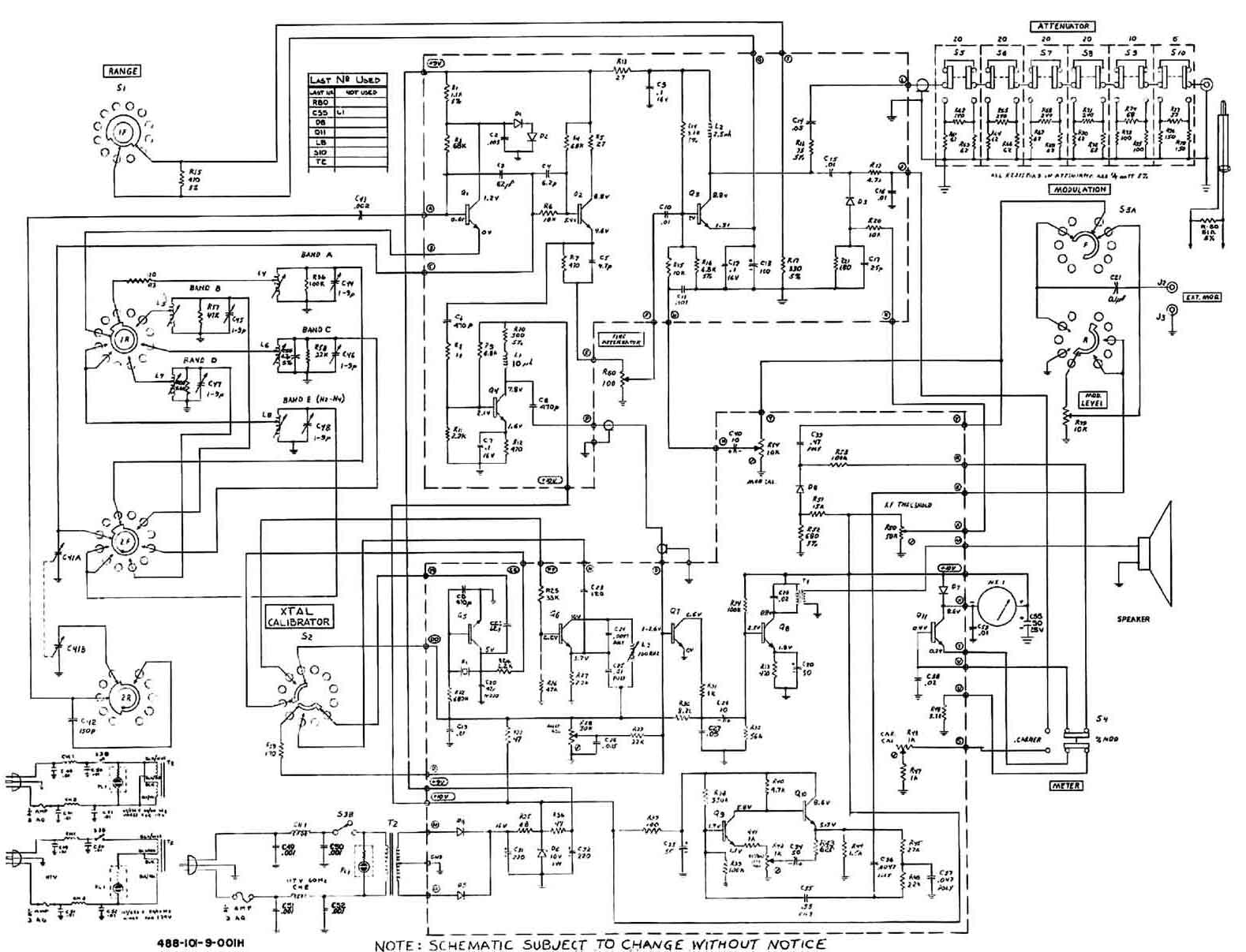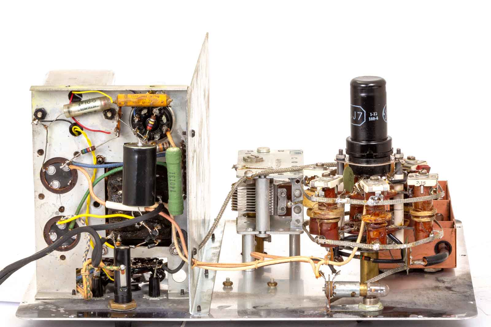 De linker aluminium doos is de LF-transformator van de 400 Hz-oscillator. Rechts daarvan de 6J5 van de LF-oscillator.. De gelijkrichter is vervangen door vier 1N4007 dioden in een brugschakeling. De plaats, waar de gelijkrichtbuis ( 5Y3 of een 80) eigenlijk hoorde is bezet door een extra afvlakcondensator. In de latere modellen werd de LF-triode vervangen door een mengbuis (6U8). Het heptode-gedeelte werd gebruikt als LF-oscillator van het Wienbridge-principe. Dat scheelt weer in gewicht, want de LF-trafo is verdwenen. Het triodedeel werkte als katodevolger voor het leveren van de LF-uitgangsspanning.
