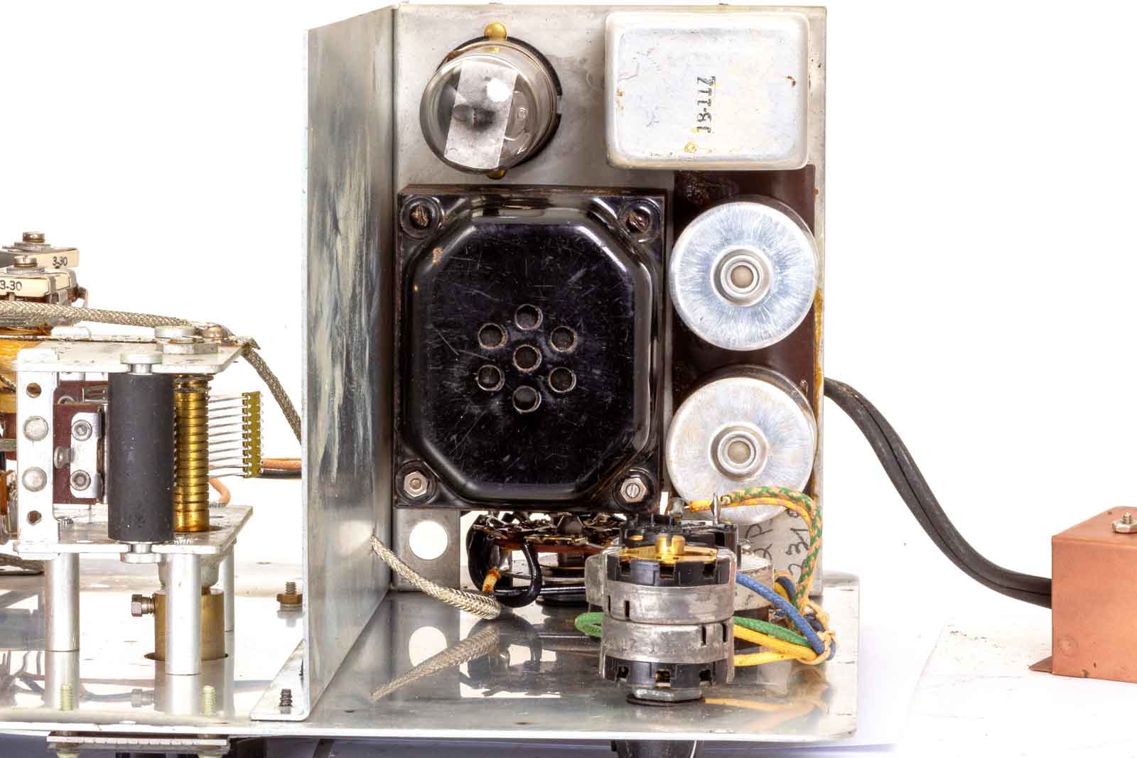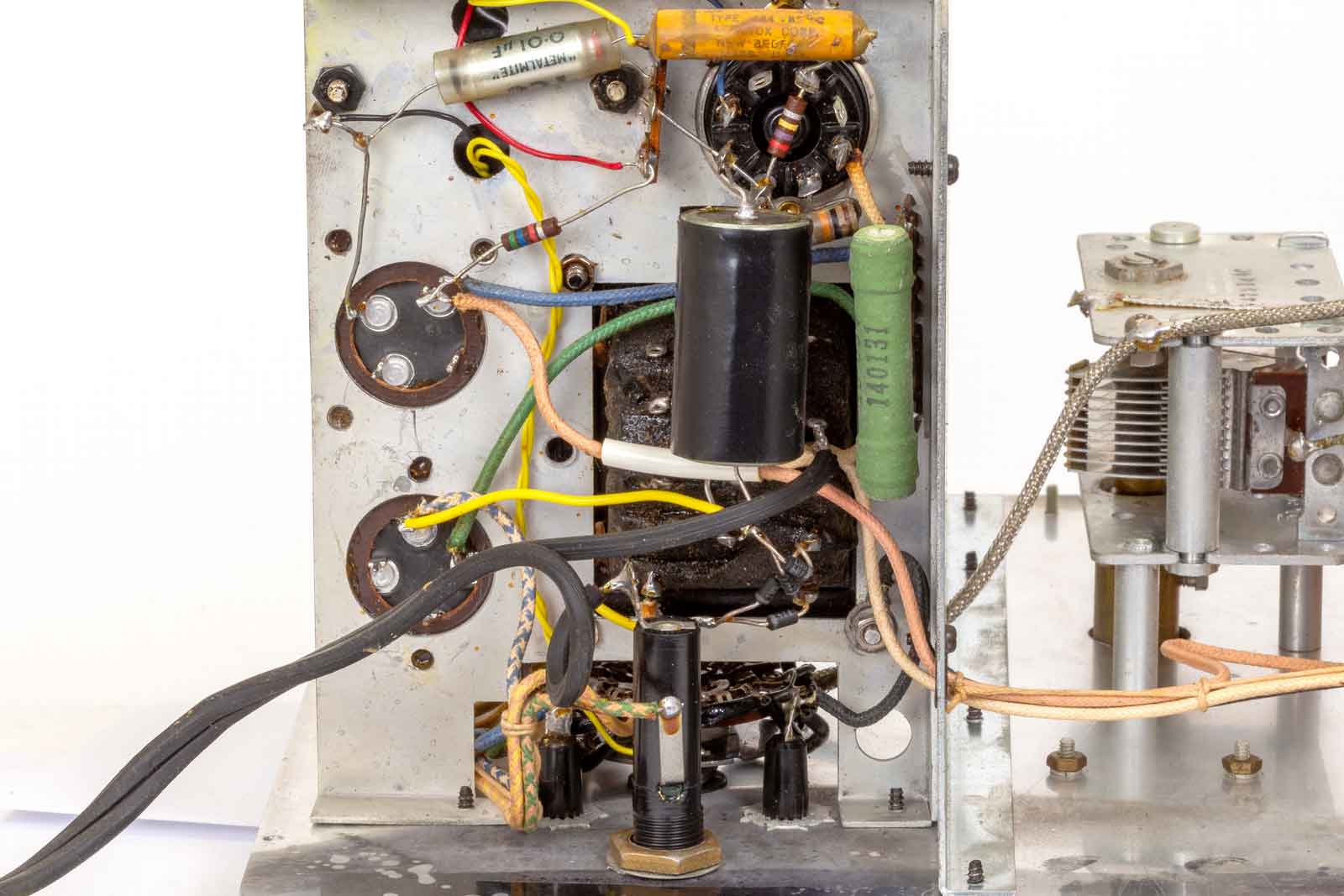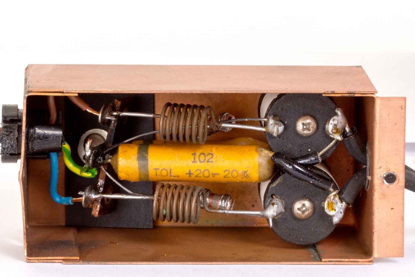 Links de aansluitingen van het netsnoer. Dan de twee VHF-smoorspoelen die weer verbonden zijn met twee HF-smoorspoelen. Van daaruit gaat het naar de aan/uitschakelaar en de voedingstrafo.De twee aansluitpunten voor de voeding van het binnenwerk zijn nog met twee "ratel-condensatoren" ontkoppeld. Dit zijn papier-condensatoren die het best kunnen worden vervangen. Het geheel is ondergebracht in een koperkleurig blikken kastje.