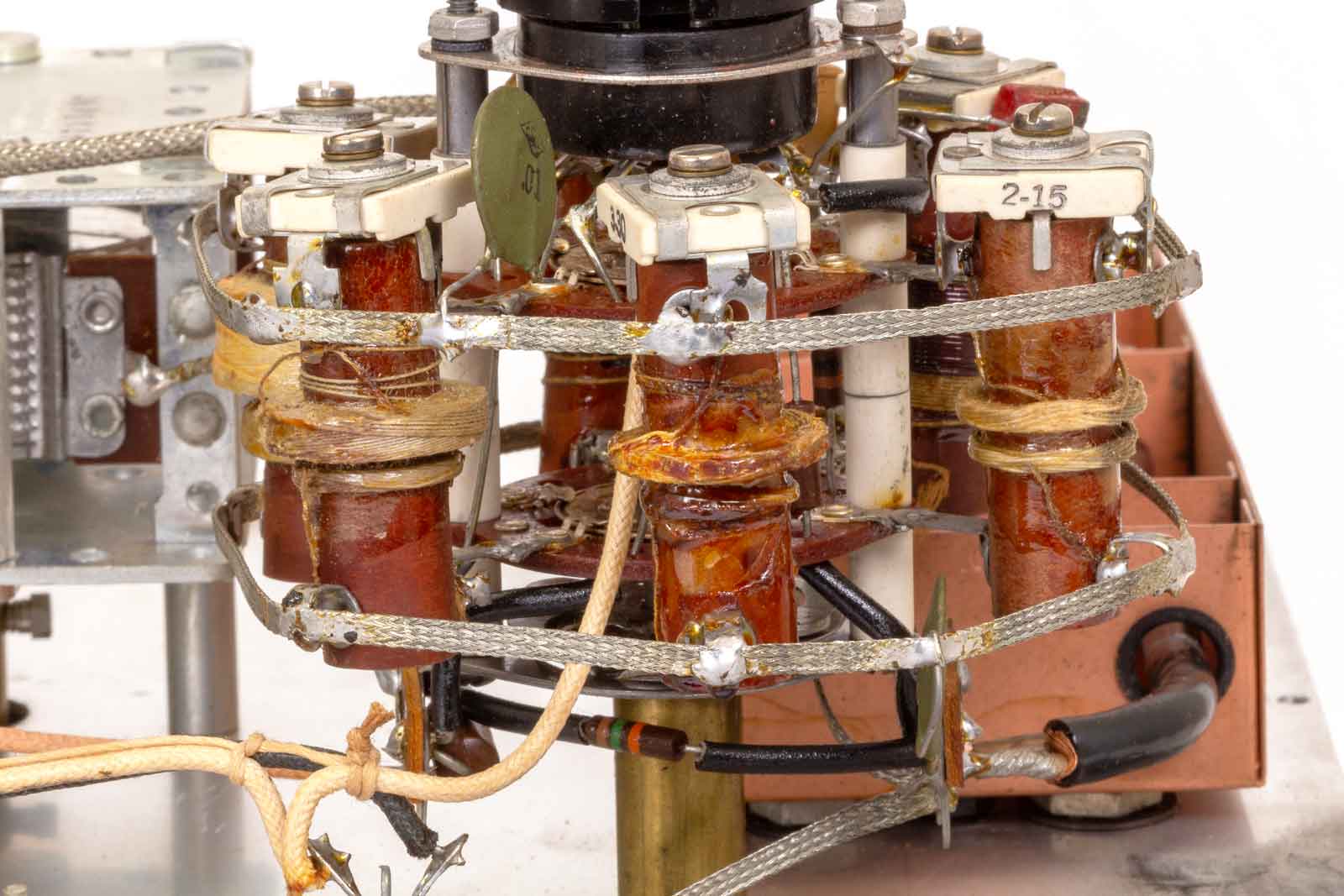 Zijaanzicht van de oscillator. Er is gebruik gemaakt van een soort desoldeer-litze om alle gemeenschappelijke verbindingen van de spoelsets met elkaar te verbinden.