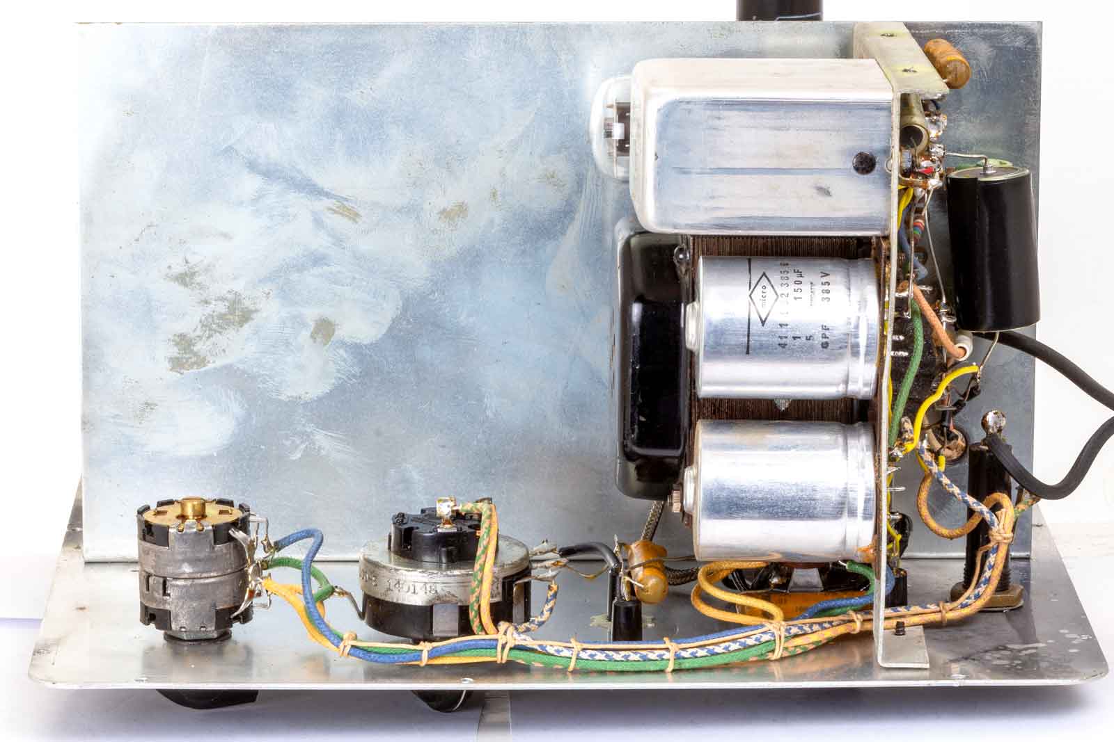 Dit is uitvoering met de LF-trafo onder het chassis. De gelijkrichter op de plek van de 6J5 en de 6J5 aan de kant van de afvlak-condensatoren.