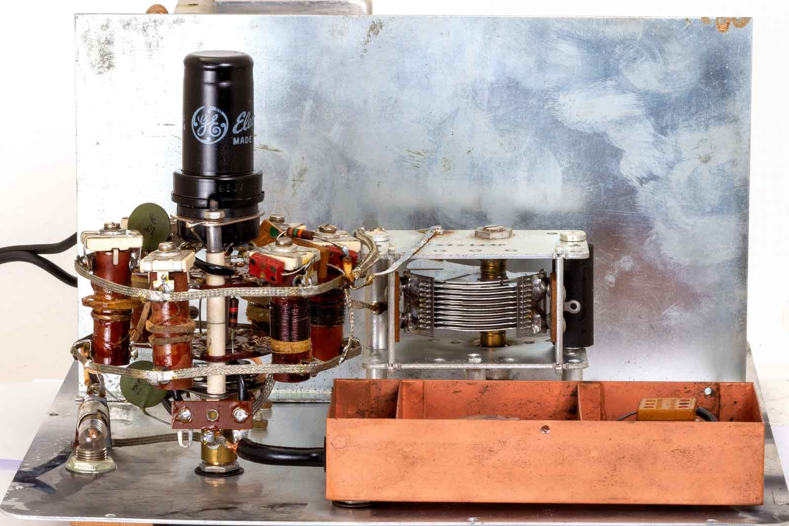 Aan de andere kant de afstemcondensator en de beide potmeters voor de regeling van de HF-spanning. De bovenste voor de grofregeling en de onderste voor de fijnafstelling. Alles netjes in een (weer) goudkleurige, blikken behuizing.