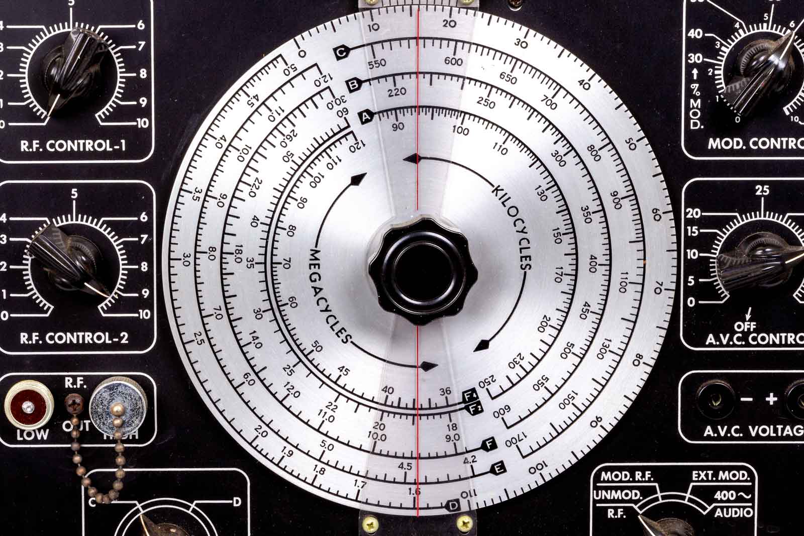 Het meest in het oog springend is de grote schaal met daarop de schaalverdelingen van de acht banden. In werkelijkheid zijn het echter zes banden. De stand F wordt ook gebruikt met de tweede en vierde harmonische.