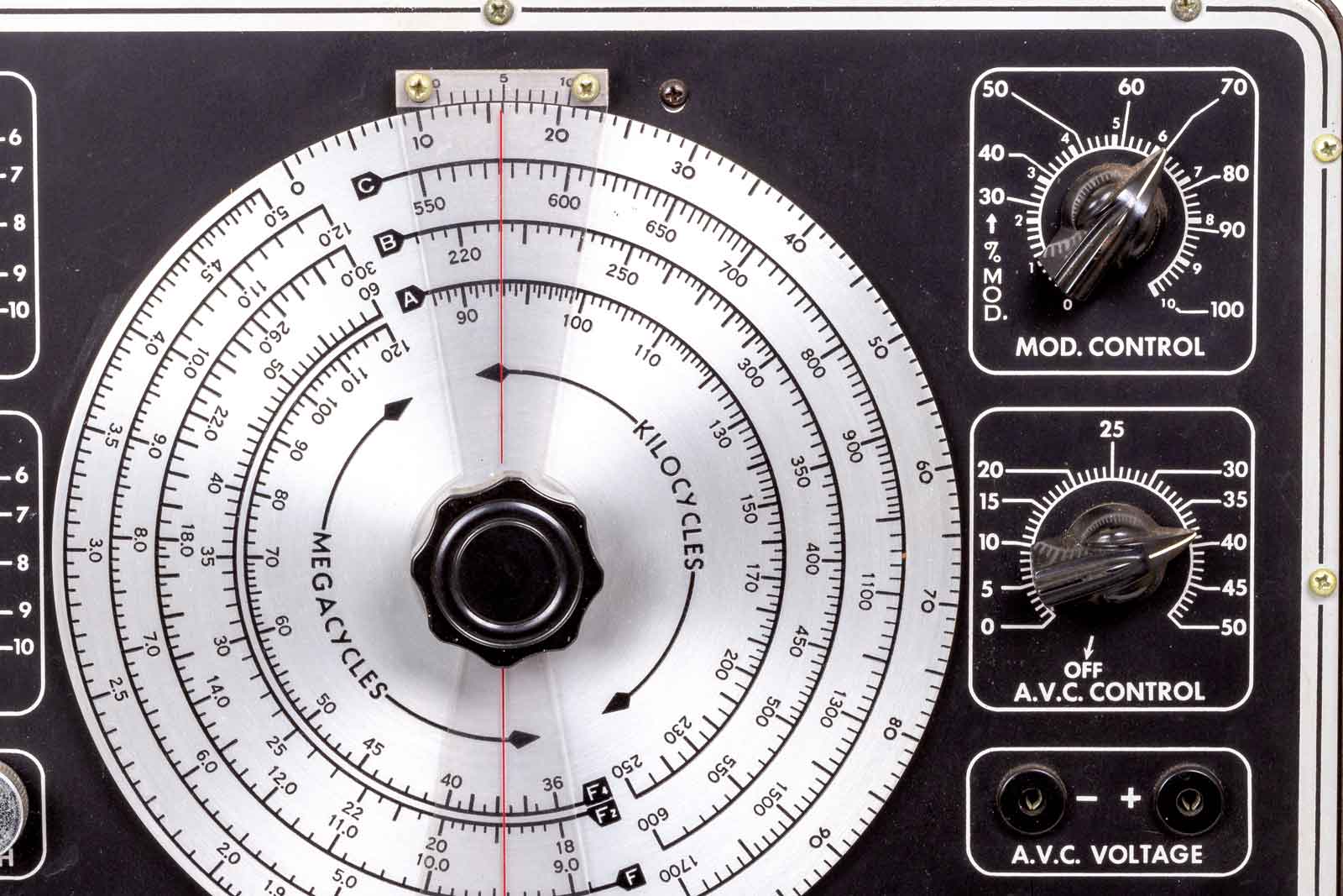 Op de bovenste MOD-CONTROL, kan de modulatiediepte ingesteld worden. Daaronder een bijzondert knopje. De AVC-control. Het is de Aan/uit-schakelaar van het instrument , maar er kan tevens een regelbare, negatieve spanning ingesteld en gebruikt worden om de AVC-spanning in het af te regelen toestel te simuleren. Daarbij moet deze spanning direct op de AVC-lijn gezet worden en deze lijn moet losgemaakt worden van het AVC-signaal dat van de detector afkomstig is. Onder het veel gebruikt is??? Ik betwijfel het. Onder de twee bussen met de AVC-spanning. De bussen hebben een afwijkende maat, ongeveer die van de meeste, oude, meetpennen van een universeelmeter, ca 1,5 mm.