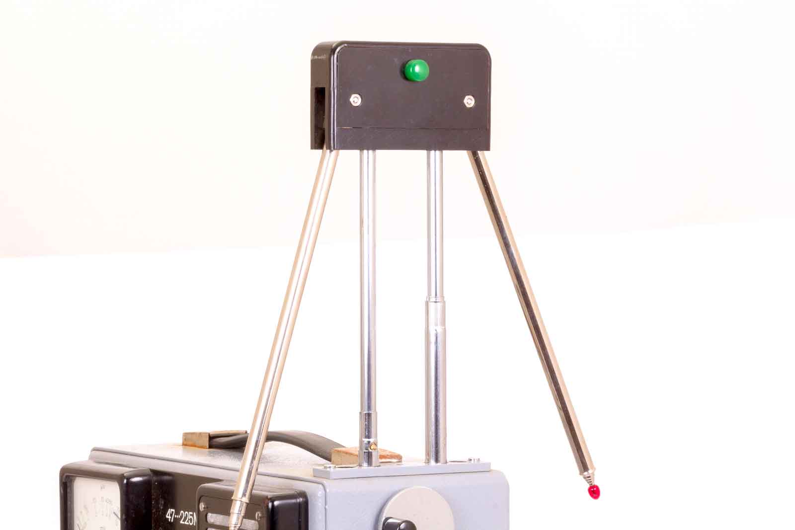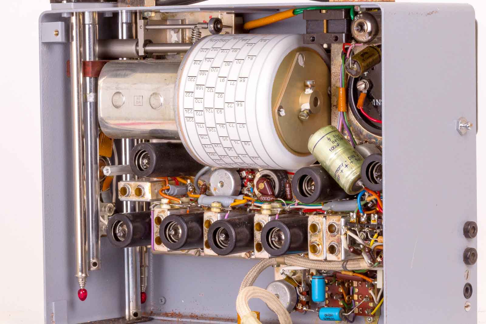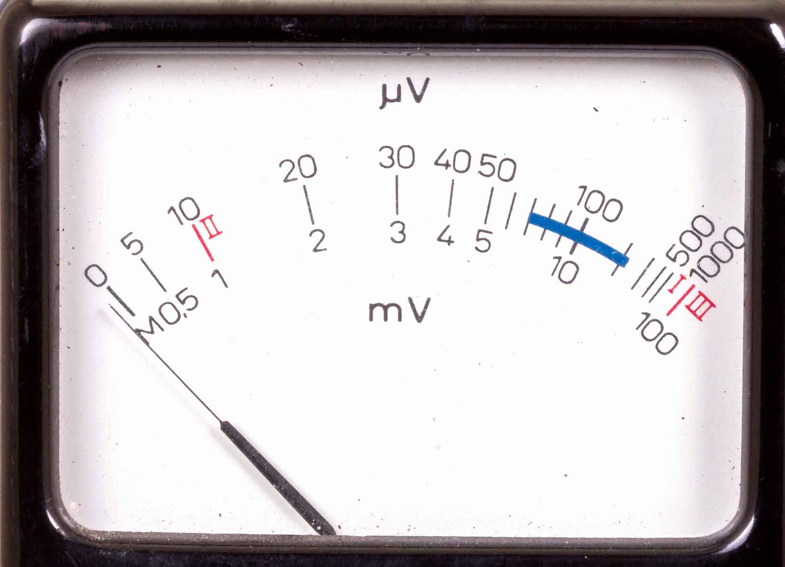Het meetinstrument. Boven de microVolt-schaal met daaronder de milliVolt-schaal. Het blauwe bereik heeft betrekking tot de toestand van de voedingsbronnen. De rode streepjes hebben te maken met de ijking van het toestel.