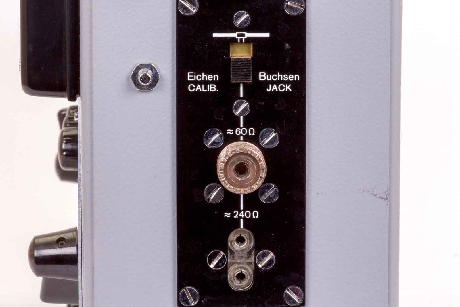 Met de schakelaar in de bovenste stand is de dipool in gebruik. Naar onderen wordt overgeschakeld naar de antennebussen. De coax-connector voor 60 Ohm en de onderste twee bussen voor 240 Ohm lintlijn. Het komt er blijkbaar niet zo op aan gezien het "ongeveer"-teken. Dat klopt ook wel het is een veldsterkte meter die niet met absolute meetwaarden werkt. Het gaat hier om het vast stellen van de maximale spanning die dan vergeleken kan worden met ander meetlocaties of zender instellingen. Het ziet er allemaal "Duits degelijk" uit. De firma Rohde & Schwarz heeft altijd een goede naam gehad. Vooral het gewicht speelde nooit een belemmerende rol bij het ontwerpen van de apparatuur. Dit kastje weegt echter maar ca. vier kilo. Dat valt erg mee.