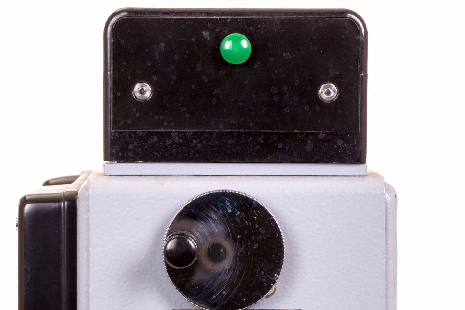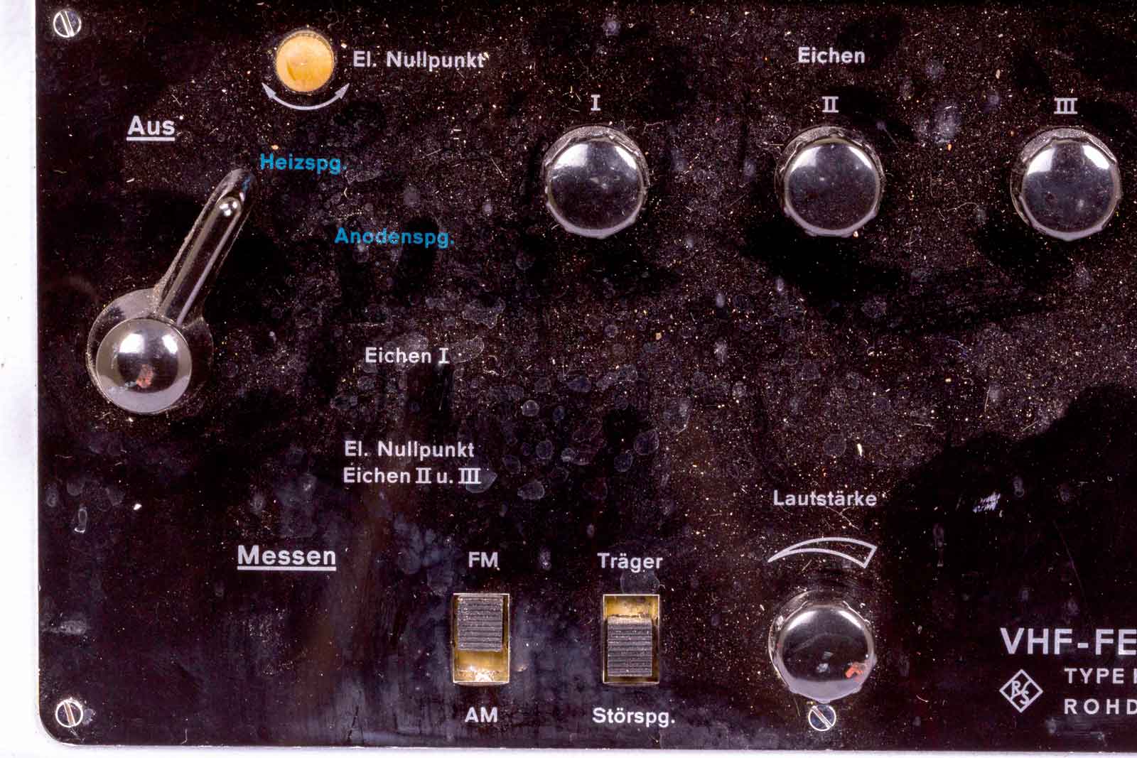 De linker kant met de grote knop voor het inschakelen van het apparaat. Eerst wordt de gloeispanning ingeschakeld, dan de anodespanning. Voor het ijken worden de twee andere standen gebruikt. De stand "Messen" is voor het uiteindelijke meten van de veldsterkte. Het oranje knopje boven deze schakelaar dient er voor om het electrisch nulpunt in te stellen. Deze knop kan zonder los te schroeven uit het gat getrokken worden. Dat is nodig omdat anders de frontplaat niet verwijderd kan worden. ( Om bv. buisnr. 7 te vervangen).