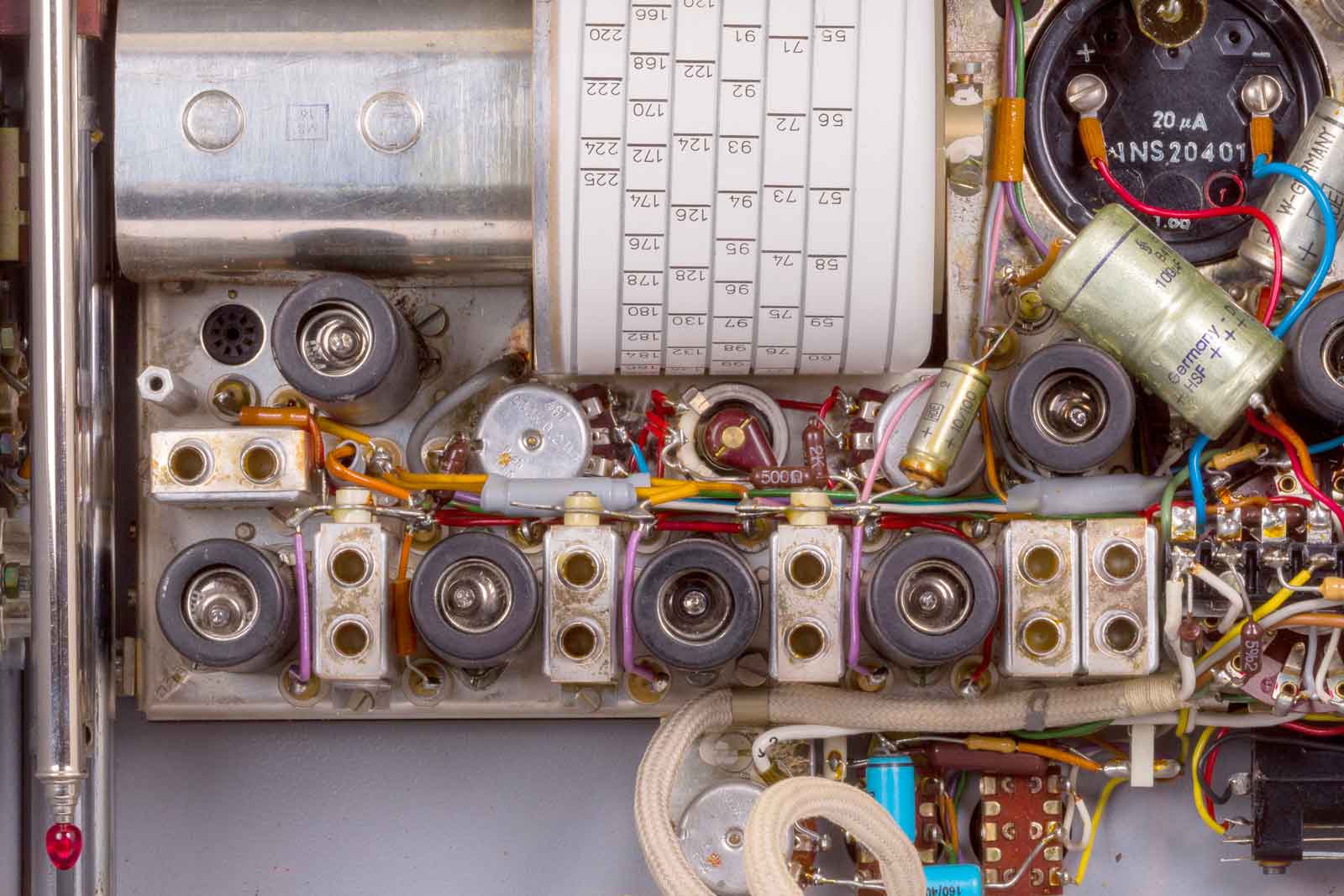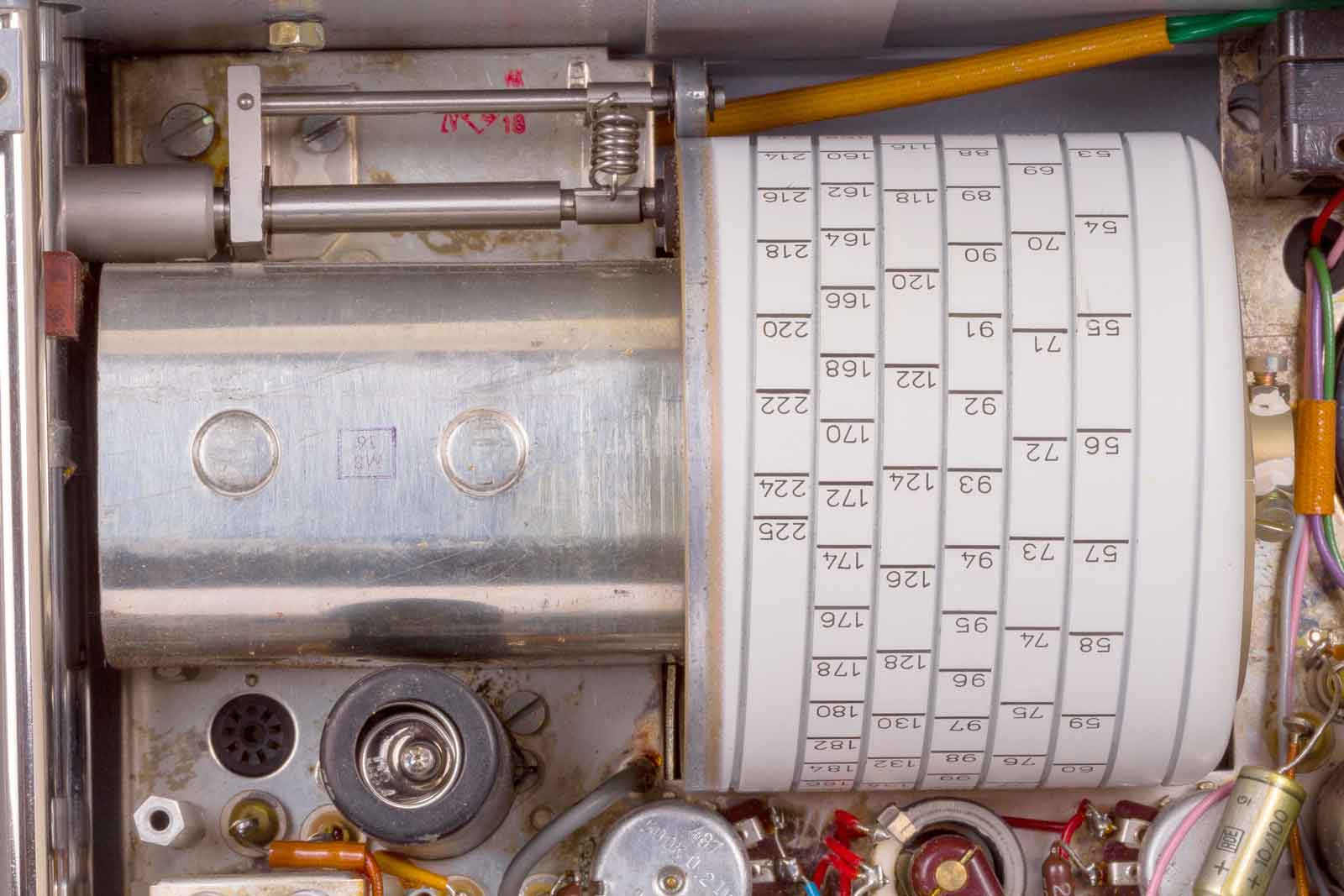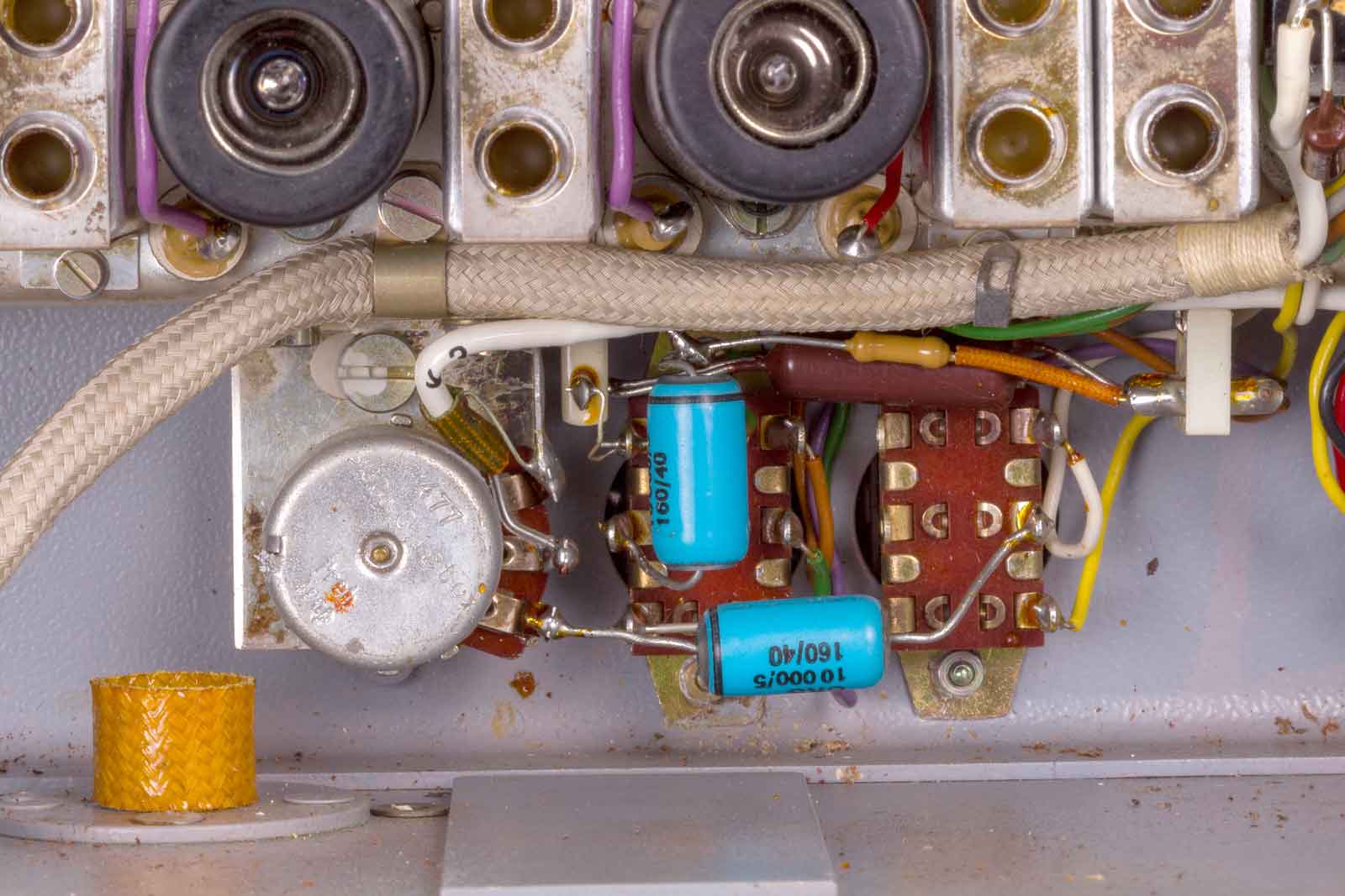 Rechts, de grote knop met de twee standen voor de ijking. Voor het demonteren van de frontplaat dienen alle knoppen verwijderd te worden. De kleine knopjes hebben een schroefje met een sleuf. Deze schroeven zijn in de as gedraaid en met een zeer klein schroevendraaiertje te verwijderen. Het is raadzaam eerst de twee grote knoppen te verwijderen, anders zijn de kleine erg lastig los te schroeven. Overigens zijn de schroeven van de grote knoppen op de zelfde wijze bevestigd alleen zijn dit geen schroeven met een sleuf, maar Amerikaanse met een soort inbusgaatje.