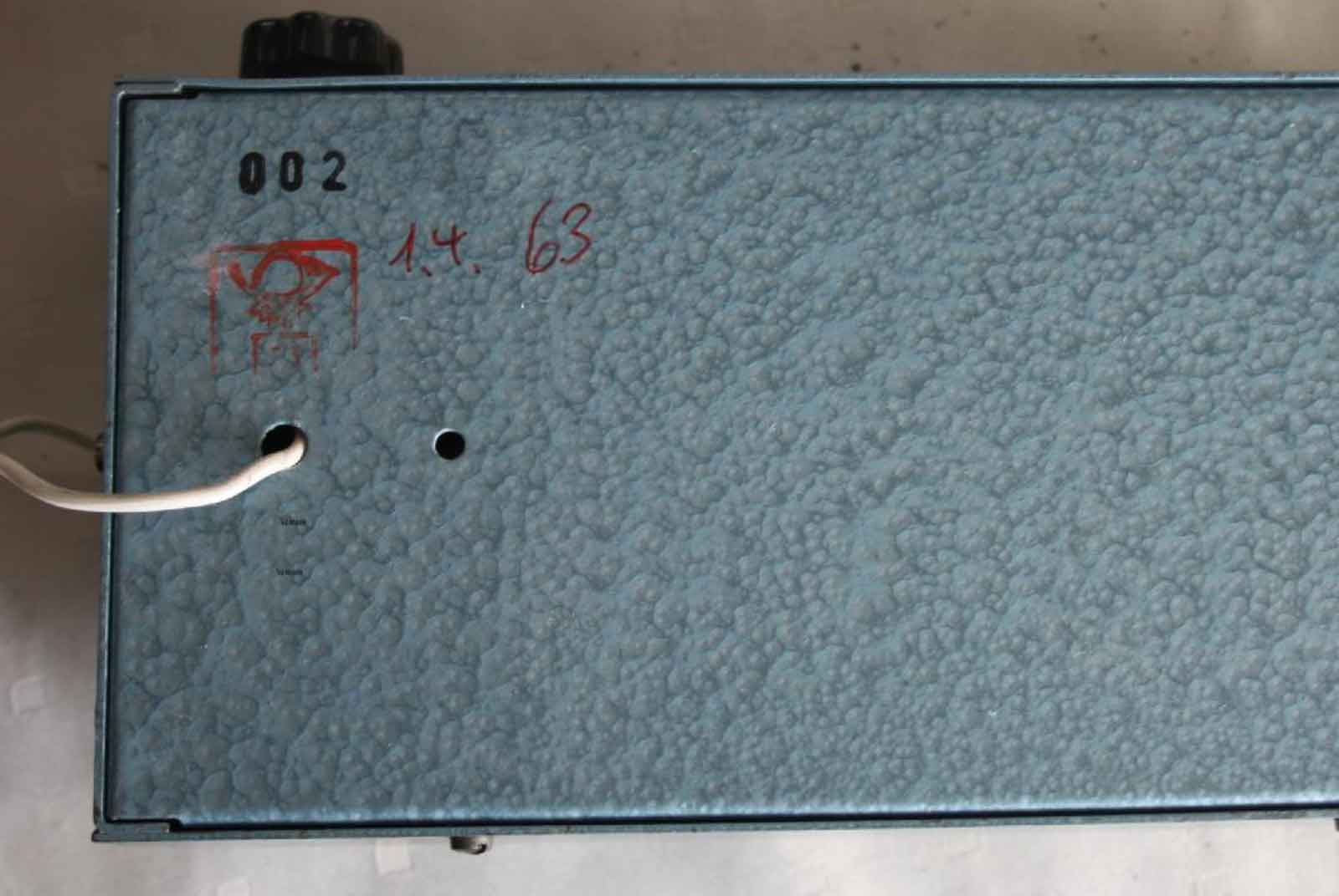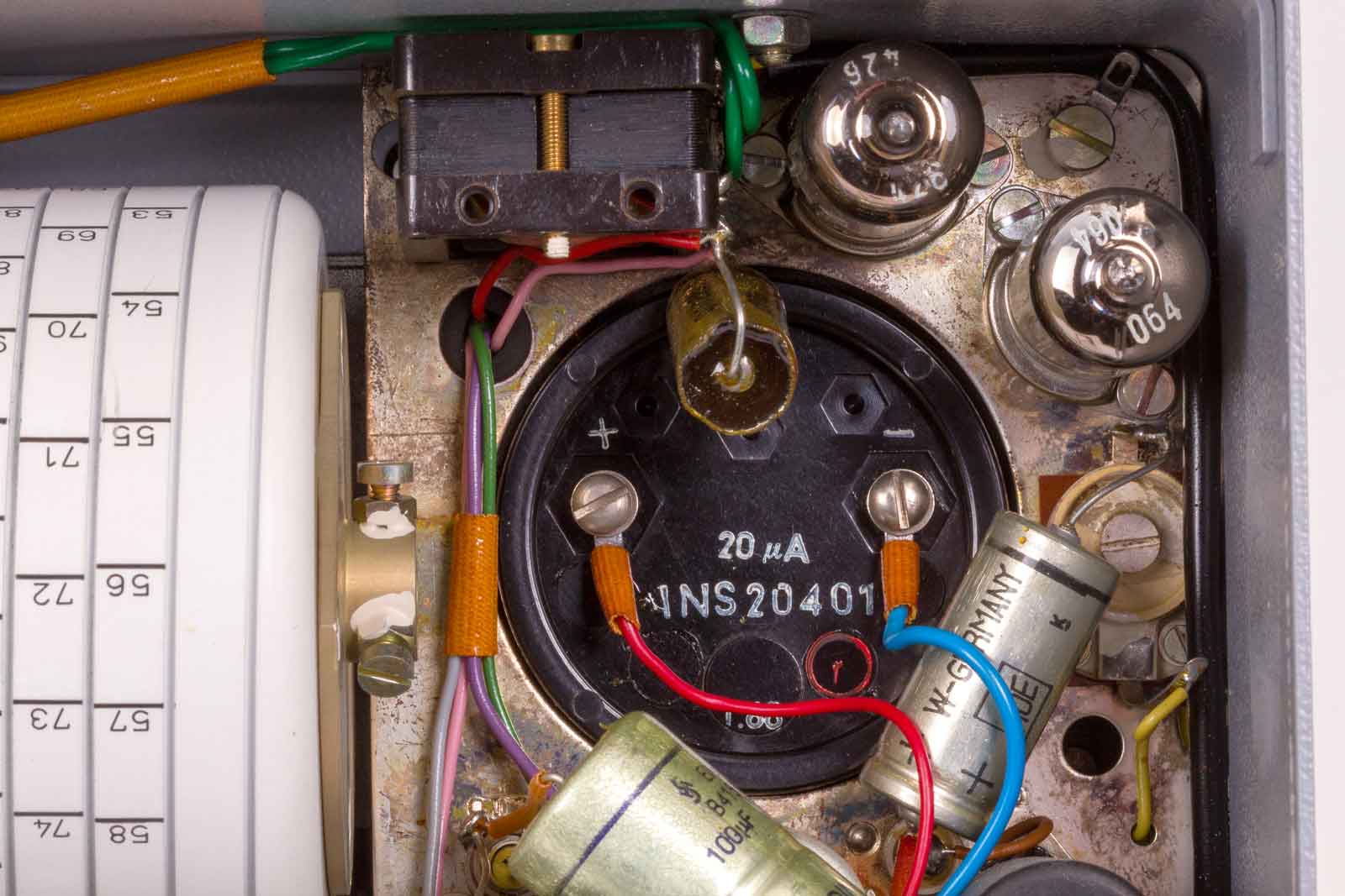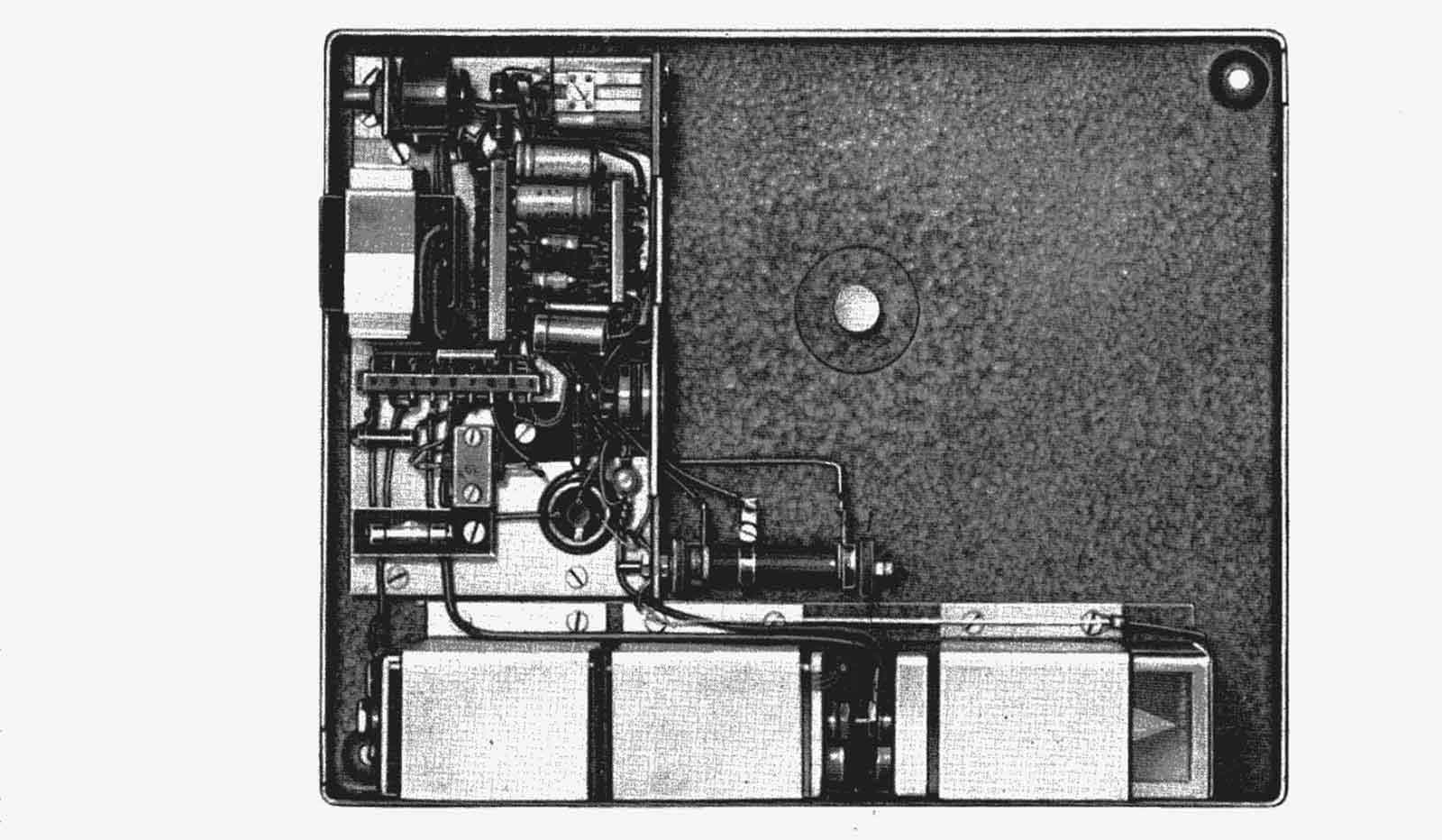 De voeding, uitermate modern met transistoromvormer voor de 67,5 Volt anodespanning. Het apparaat werkt met oplaadbare batterijen die in een houder aan de linkerkant bevestigd worden.