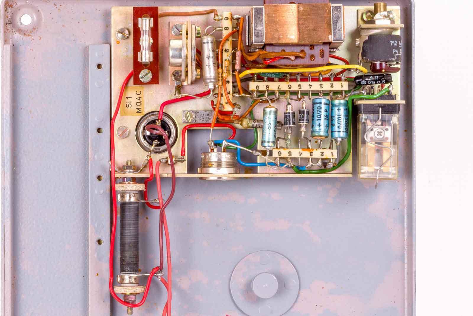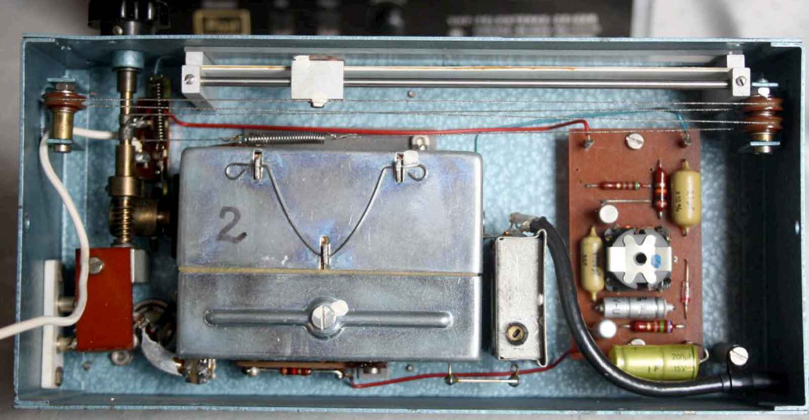 Het binnenwerk. In de metalen doos bevindt zich de converter, waarschijnlijk een bestaande unit uit een TV-toestel, rechts de omvormer van 6 naar 12 Volt..