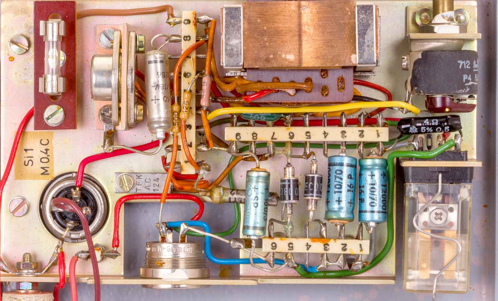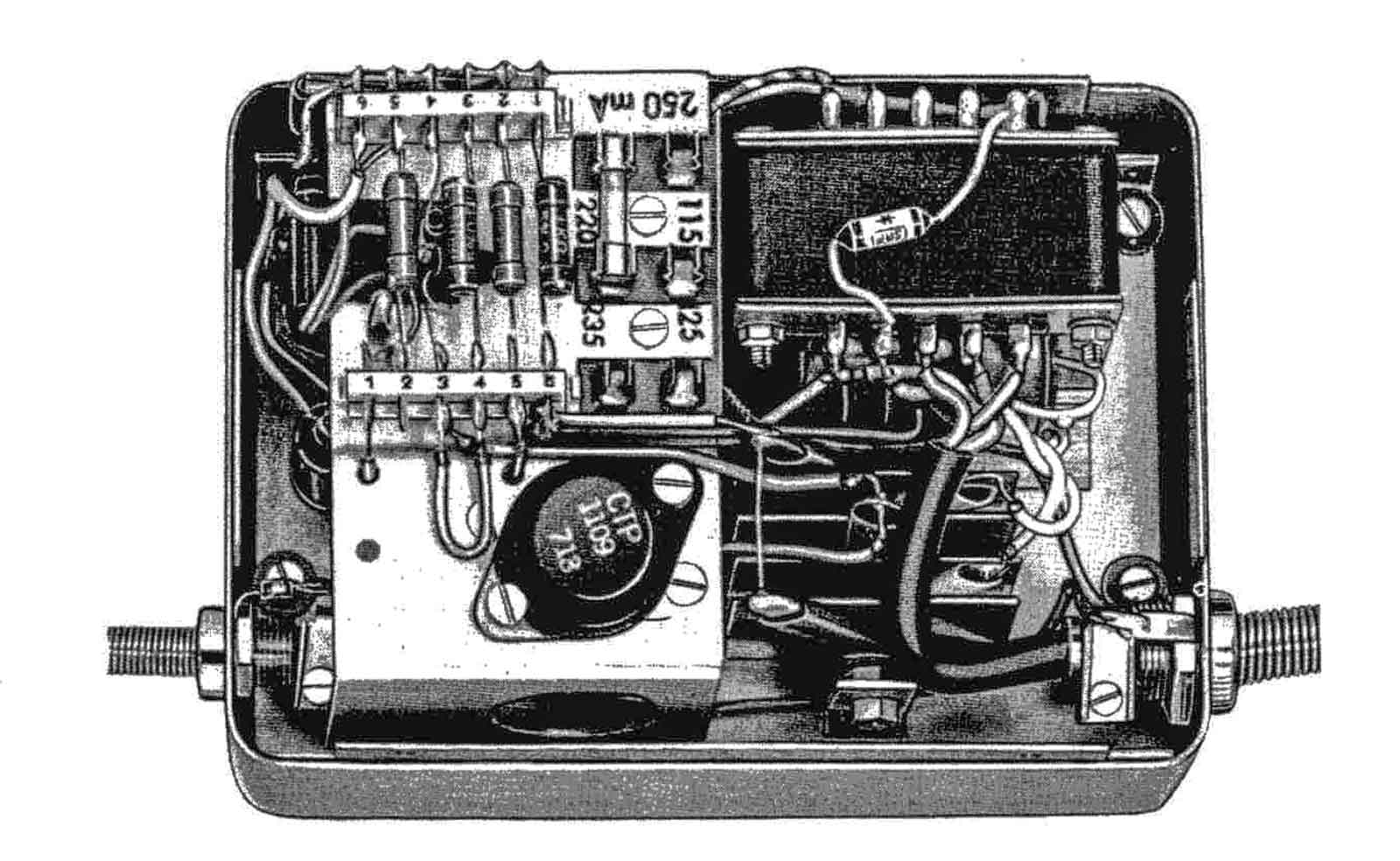 De voeding met de transistoromvormer. De stuurtransistor, een AC124 is ook nog voorzien van een soort referentiespanning. Waar die zit heb ik niet kunnen ontdekken.