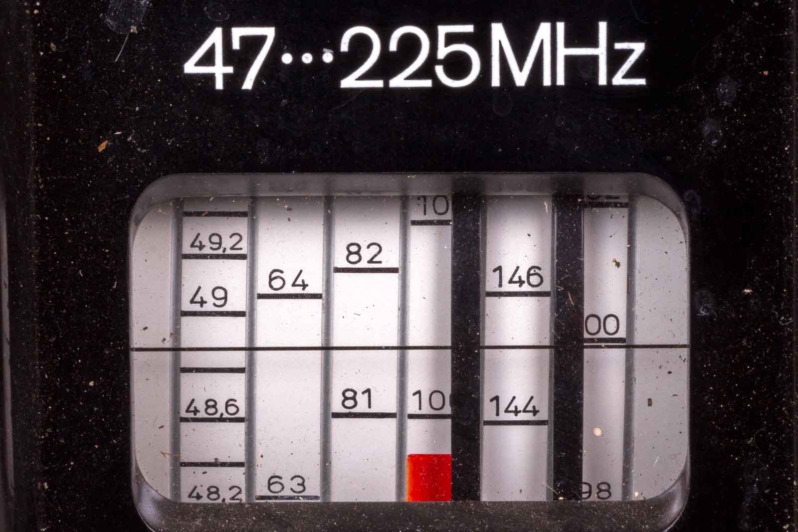 Het totale bereik staat hier zeer duidelijk aangegeven. De twee brede zwarte, vertikale balken bewegen met de afstemming mee en daartussen in staat de afgestemde frequentie. In bovenstaande afbeelding 145 MHz, midden in de amateur twee-meterband.