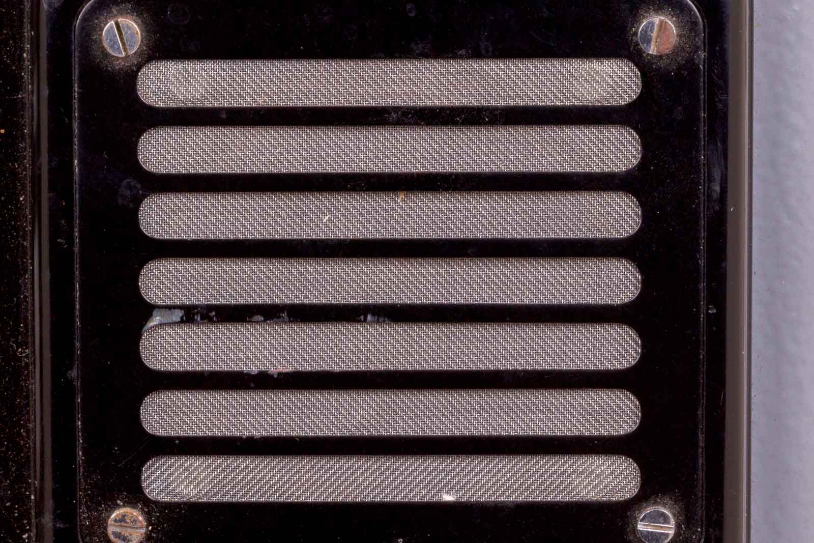 Om de werkzaamheden wat te veraangenamen kan ook meegeluisterd worden. De kristal-luidspreker is achter dit mooie gaas gemonteerd.