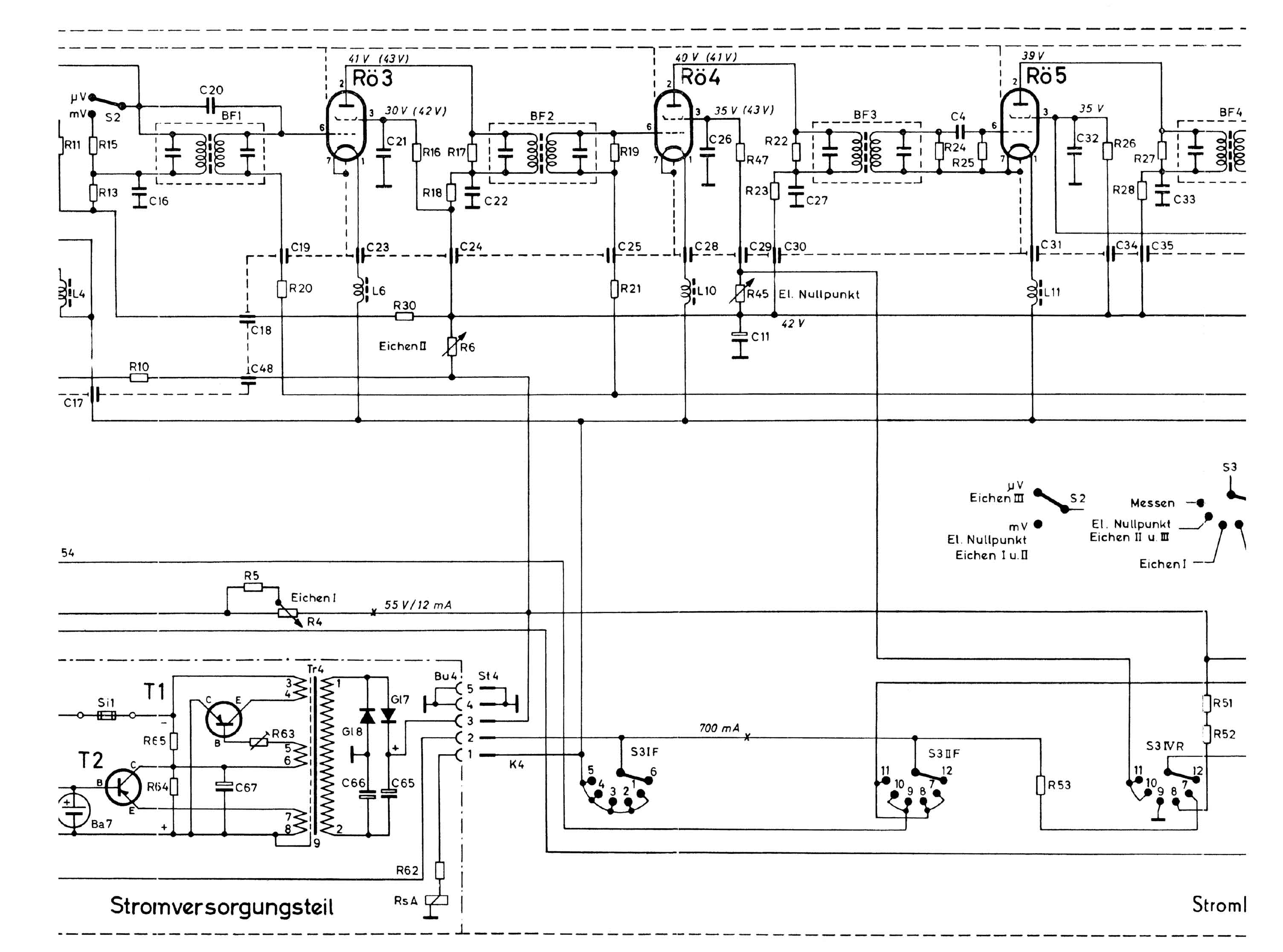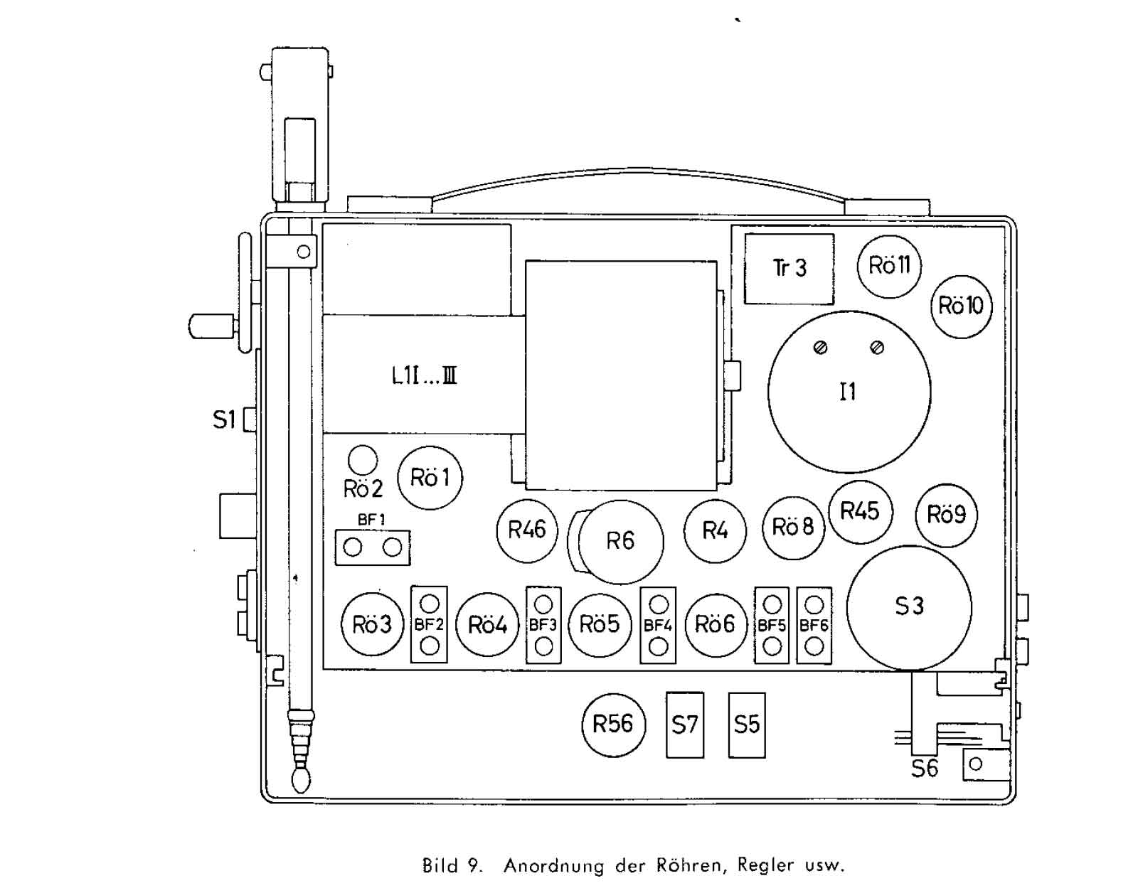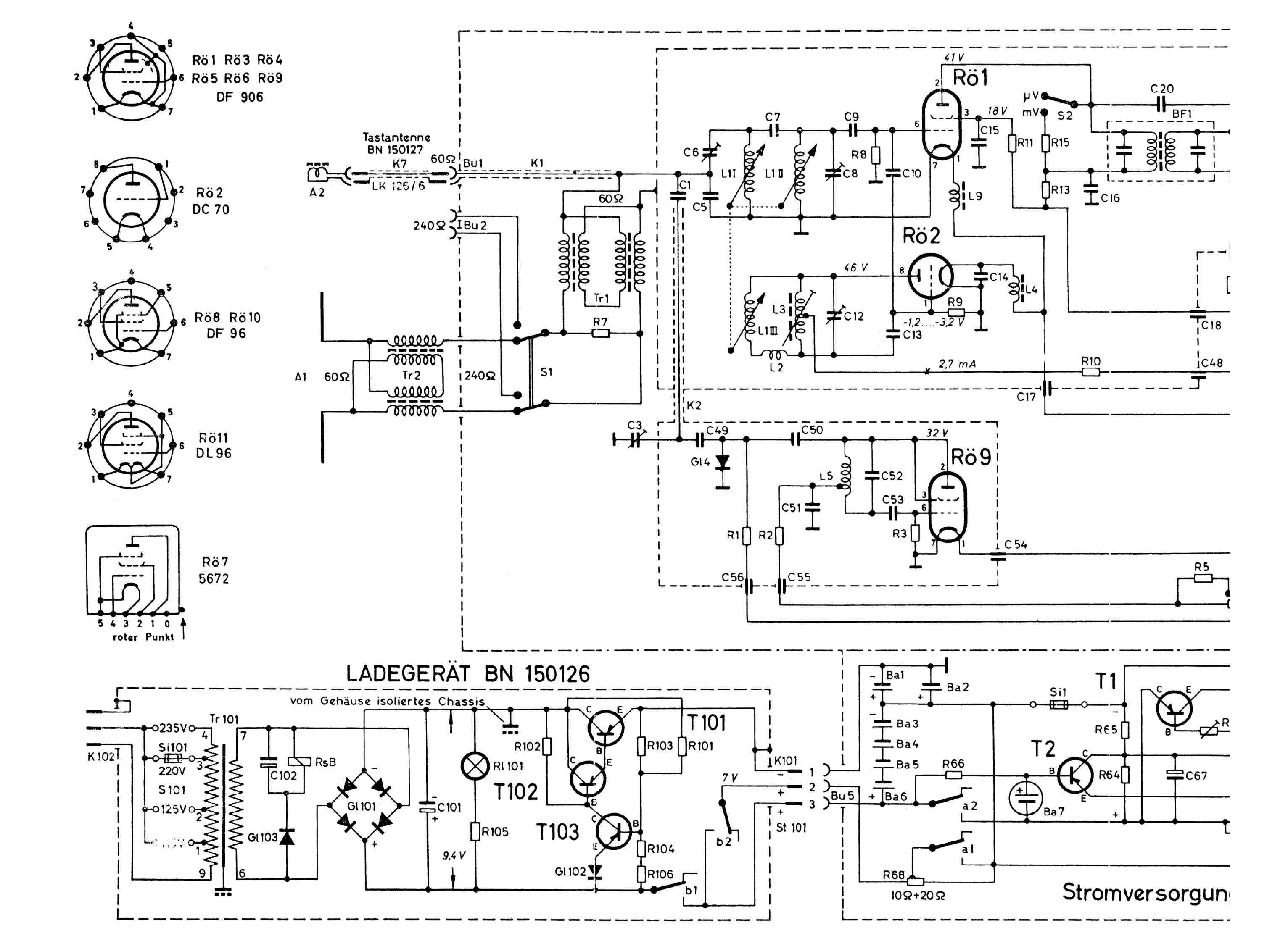 De vijfde MF-trafo met AM-detector Rö7 (6572). Dat is ook een pencil-tube. Deze kan alleen losgesoldeerd worden wanneer de frontplaat verwijderd is. Rö8 (DF96) versterkt het MF-signaal nog eens om dan met behulp van de discriminatorspoel (BF6) gedetecteerd te worden voor FM-ontvangst. Rö 10 en 11 vormen samen de LF-versterker waarbij Rö10 een DF96 is en de eindbuis Rö11 een DL96.