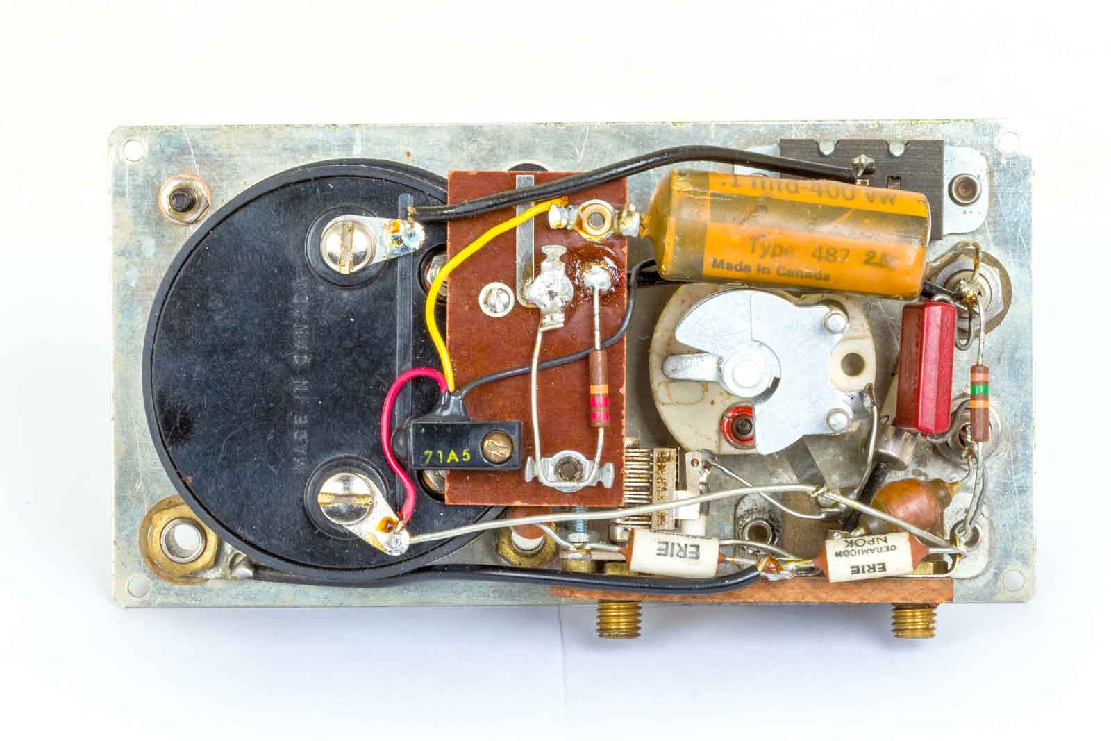 De zijkant met de spoel-aansluitingen. De zwarte draad naar de meest linkse bus is de antenne-aansluiting ANT1 die direct aan V1 ( de 1N34) is aangesloten en via de capacitieve spanningsdeler C3-C4 op de spoel uitkomt. De aansluiting ANT2, rechts op de meter is via C7 ( 5 pF) verbonden met de spoel.