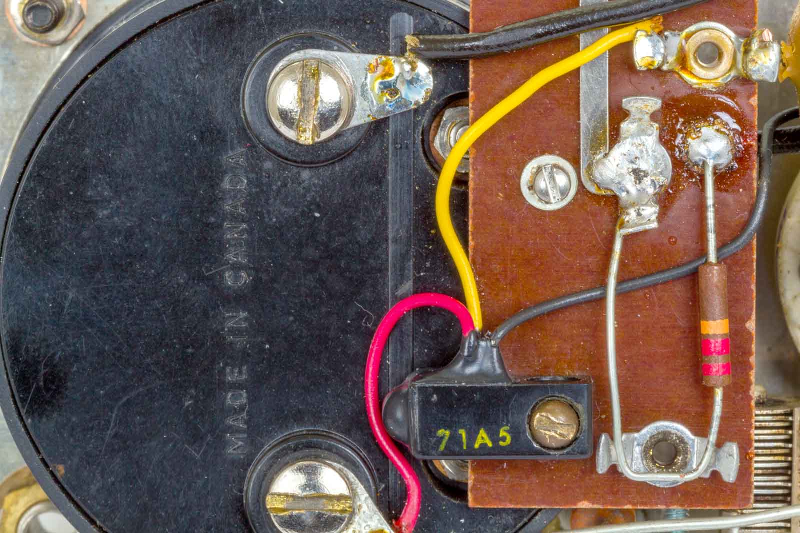 De aansluitingen van de meter. De dubbel-diode voor de modulatiedieptemeting is hier ook op bevestigd. Dat is een koper-oxide-gelijkrichter van het type 71A5. Vind die maar eens...... De 22 kOhm weerstand is R2, die volgens de handleiding ongeveer 30 kOhm moet zijn. Boven is een contact-strip te zien die in verbinding staat met de drukknop op de meter. Wanneer je op de knop drukt overbrug je R2, de weerstand van 22 k en is de meter gevoeliger. (Alleen in de modulatie-meting-stand).
