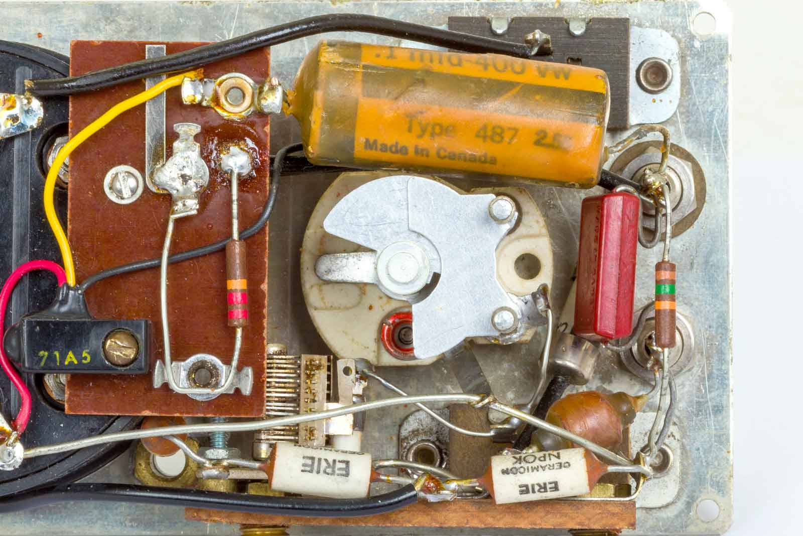 Op deze foto de afstemcondensator van 75 pF. Onder twee NPO condensatoren C3 en C4, allebei 5 pF die in verbinding staan met L2, een HF-smoorspoel. De trimmer onder links C is C1 de trimmer voor de bandspread. De weerstand (R1) , rechts over de beide bussen waarop de hoofdtelefoon kan worden aangesloten bedraagt 15 kOhm. Onder de rode condensator over de twee bussen is de detectiediode te zien van het type 1N34, een germanium-type met een lage drempelspanning. Hier kan ook bv. een OA95 worden gebruikt. De grote gele condensator van het type 487 is C6 met een waarde van 100 nF.