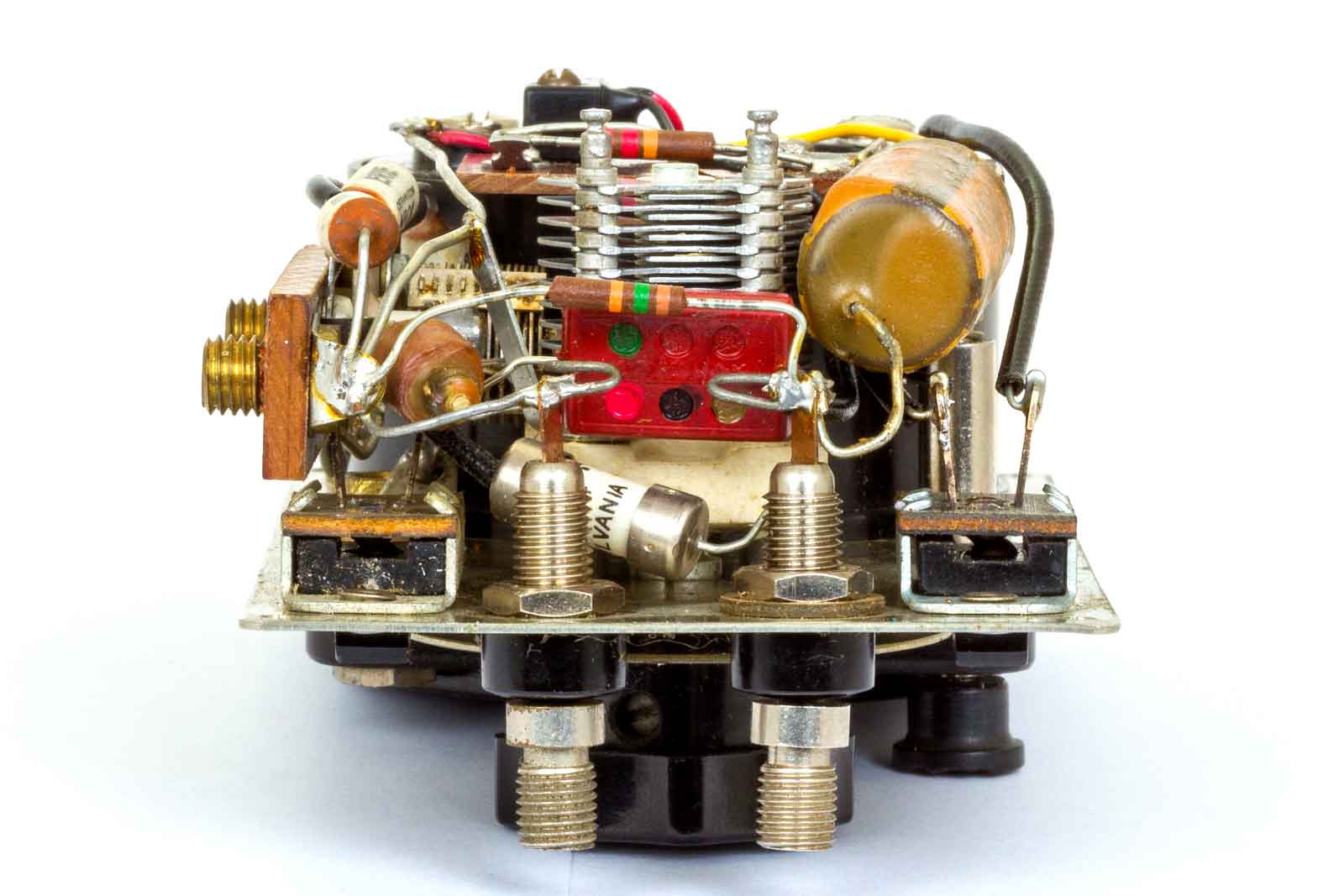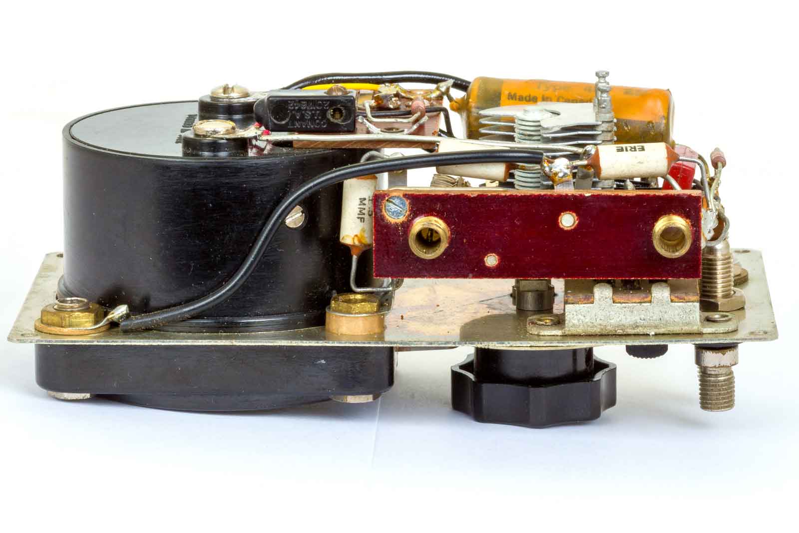 Op deze foto is de detectiediode wat beter te zien. De twee van schoefdraad voorziene zijn stekkers in de hoofdtelefoonbussen zijn gestoken. Deze hebben heel dunne pennen die met grotere bussen verbonden zijn. Hierdoor kunnen koptelefoons met standaard banaan-stekers worden gebruikt.