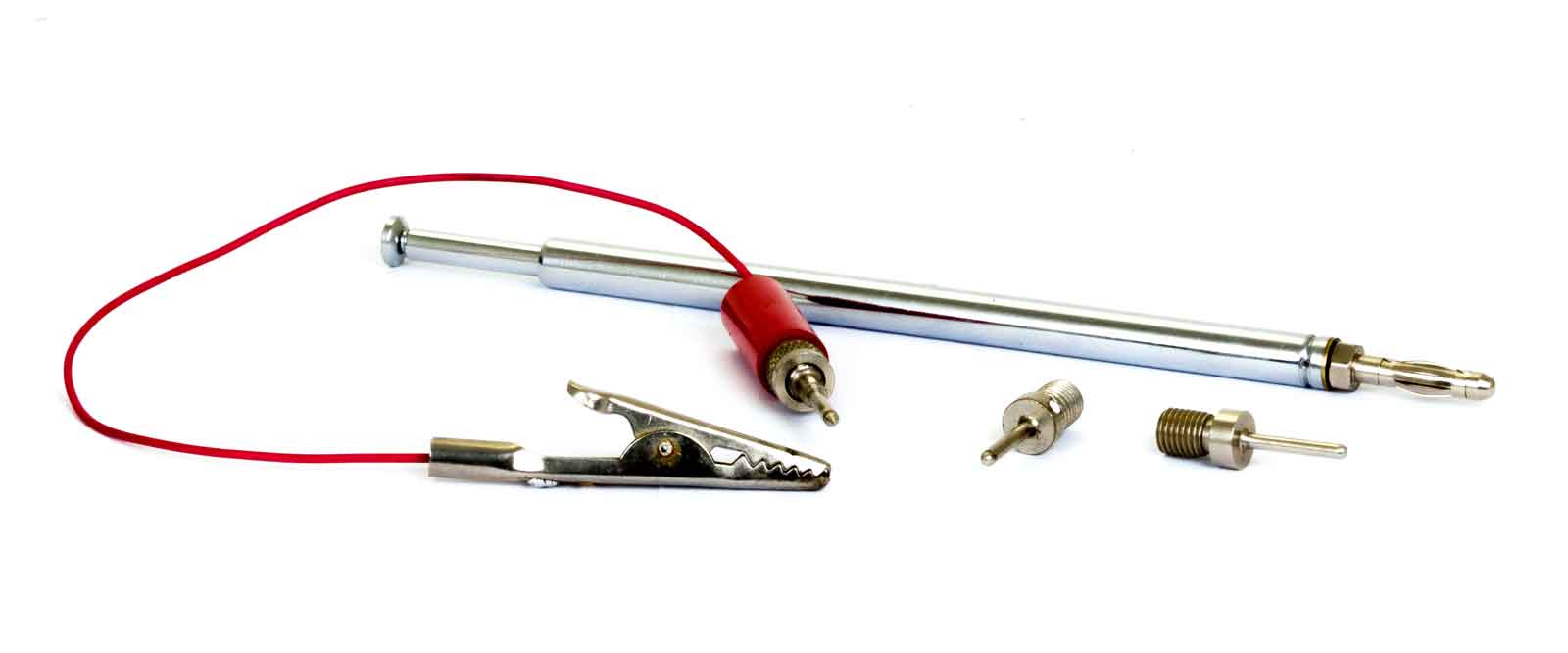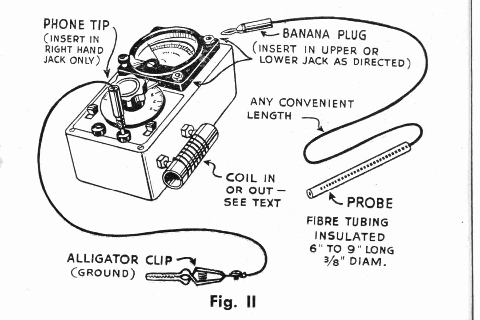 Hoewel deze telescoopantenne niet meegeleverd was, maar een fiberglasbuisje met daar in een antennedraadje, heb ik foto's in advertenties gezien met een telescoopantenne. Je kunt de meter dus prima gebruiken als veldsterkte meter. De spoel wordt zo in de zijkant geprikt.