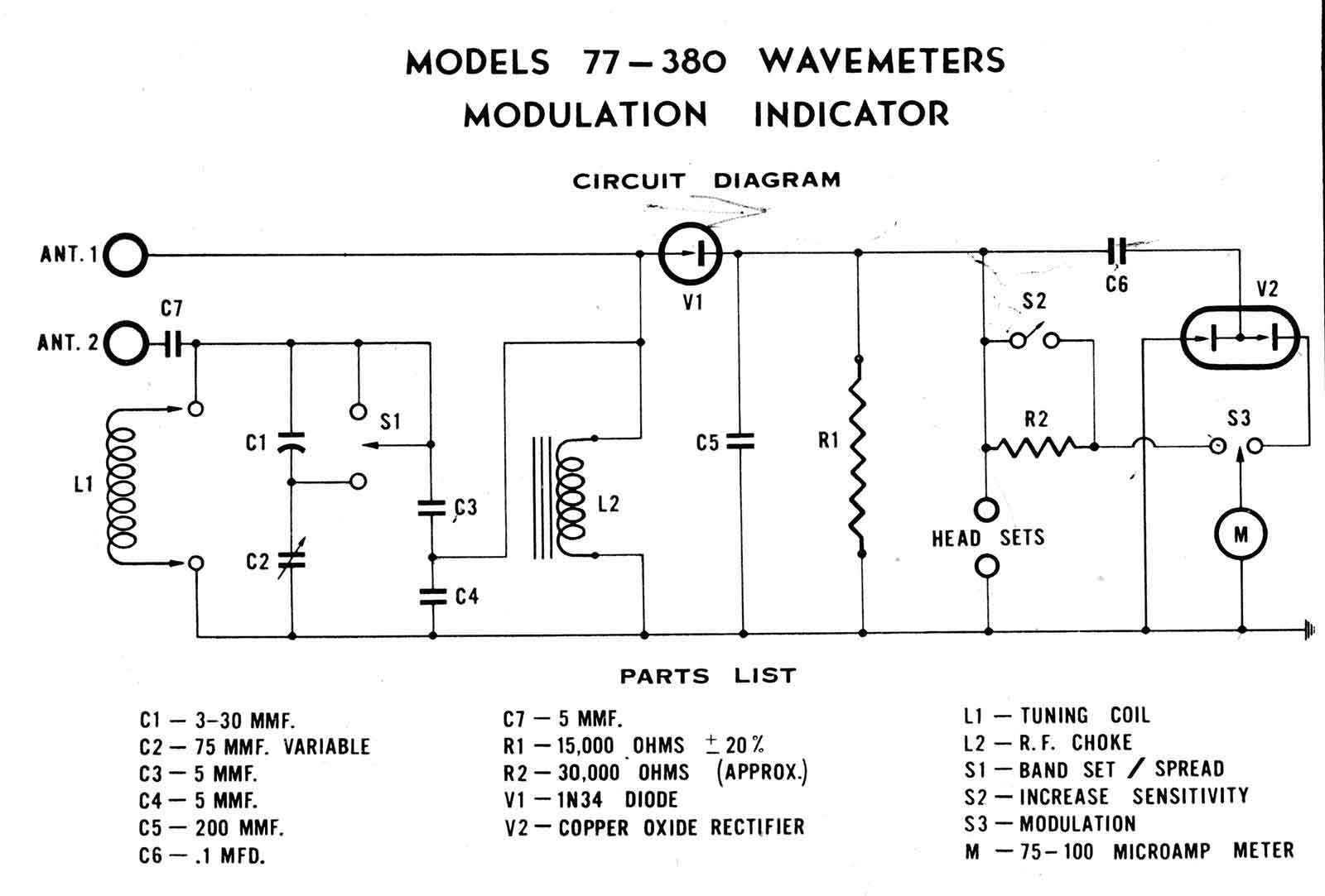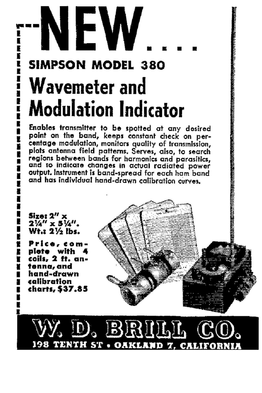 Het meetinstrument met twee schalen, "Percent Modulation" en "Relative Power". De Simpson ( De firma met de befaamde universeelmeters) draaispoelmeter van 100 muA. Links onder een drukknop van een schakelaar en rechts twee bussen voor het aansluiten van een antenne.