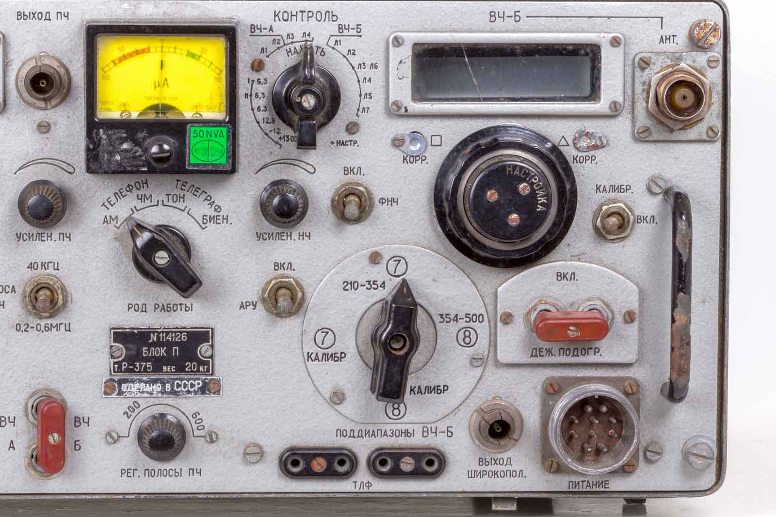 ,Telefonie, AM, FM en Telegrafie MCW , CW. Daar onder het typeplaatje met serienummer N114126, Blok P () wat dat ook mag betekenen) TR-375 en gewicht 20 kg. Gemaakt in de USSR. Daar onder een knopje voor de IF-bandbreedteregeling, 200 of 600 kHz. De knop links van de modeschakelaar is IF-versterking. De schakelaar er onder is de selectie van de bandbreedte 40 kHz of o,3 -0,6 MHz. Daar onder de keuzeschakelaar RF-ingang A of B. Hierbij is A de VHF-ontvanger van 20 tot 210 MHz.