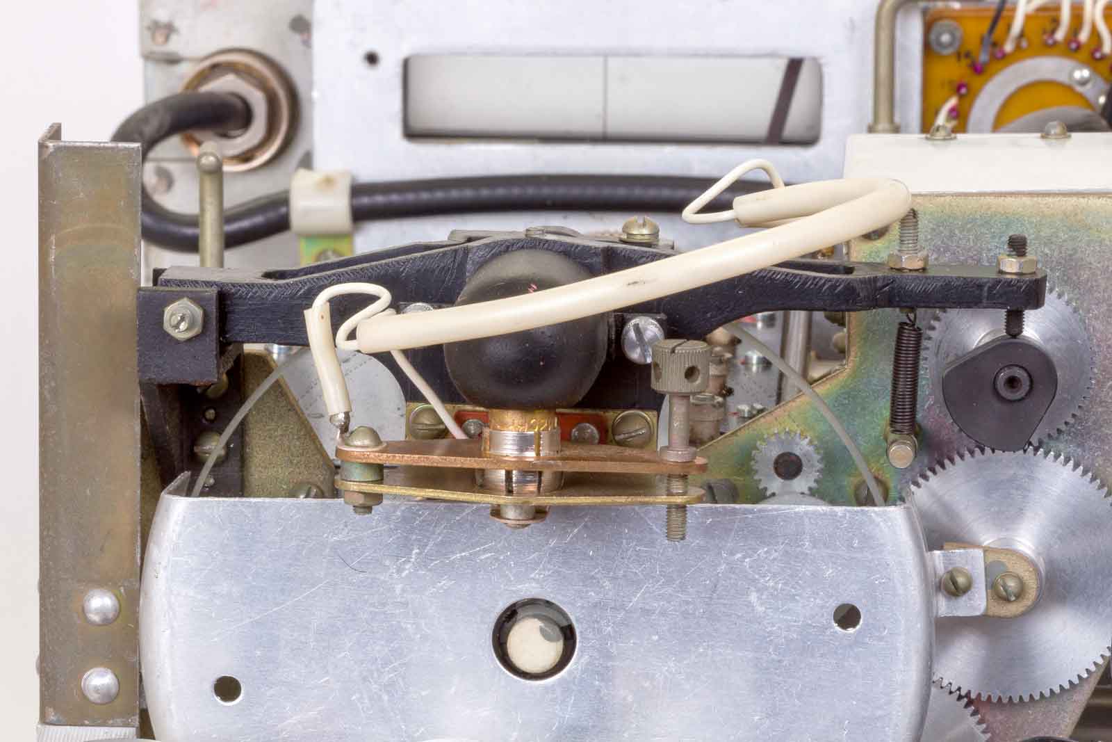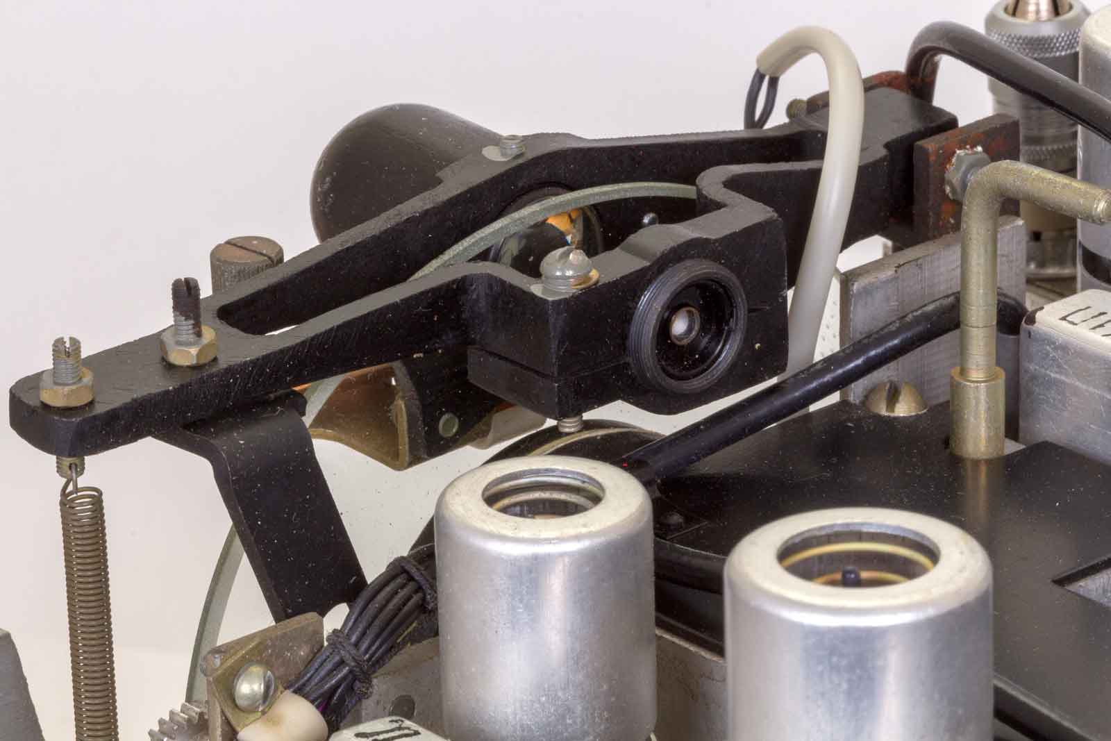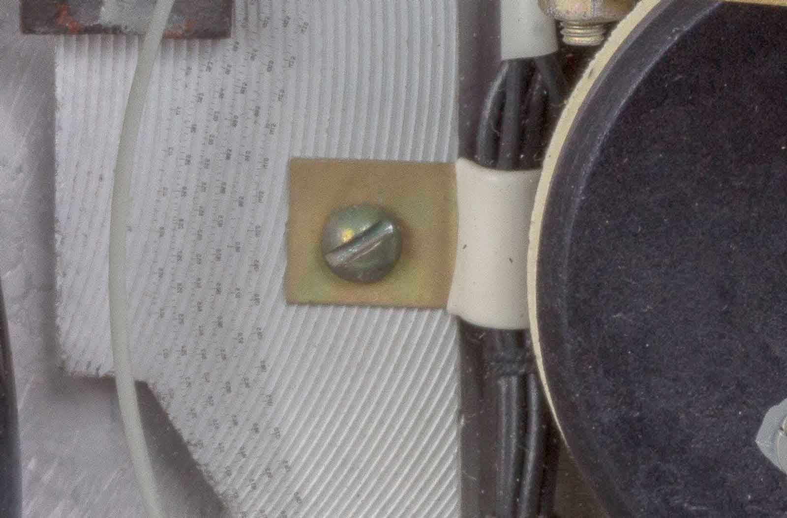 Op deze foto is de fitting te zien van het schaallampje. Rechtsboven de wals die de juiste positie van de schaal instelt en bediend wordt door de bereikschakelaar. Het lijkt wel een versnellingsbak.