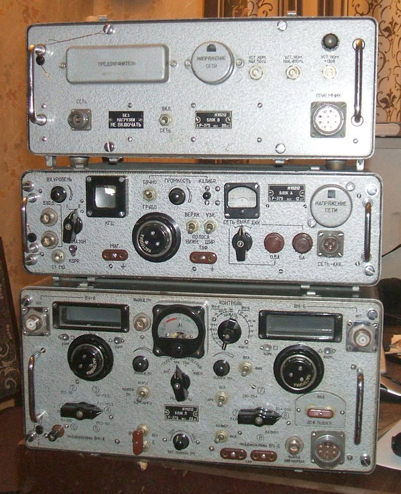 Dit lijkt wel wat op een MF-versterker vban de UHF-ontvanger met drie buizen van het type 6J1P. In het bereik 1 en 2 werkt de ontvanger met 1 IF = 4 MHz, in bereik 3 tot en met 6 met 1 IF = 30 MHz en 2 IF = 4 MHz, en in het bereik 7 en 8 met 1 IF = 72 MHz en 2 IF = 4 MHz.