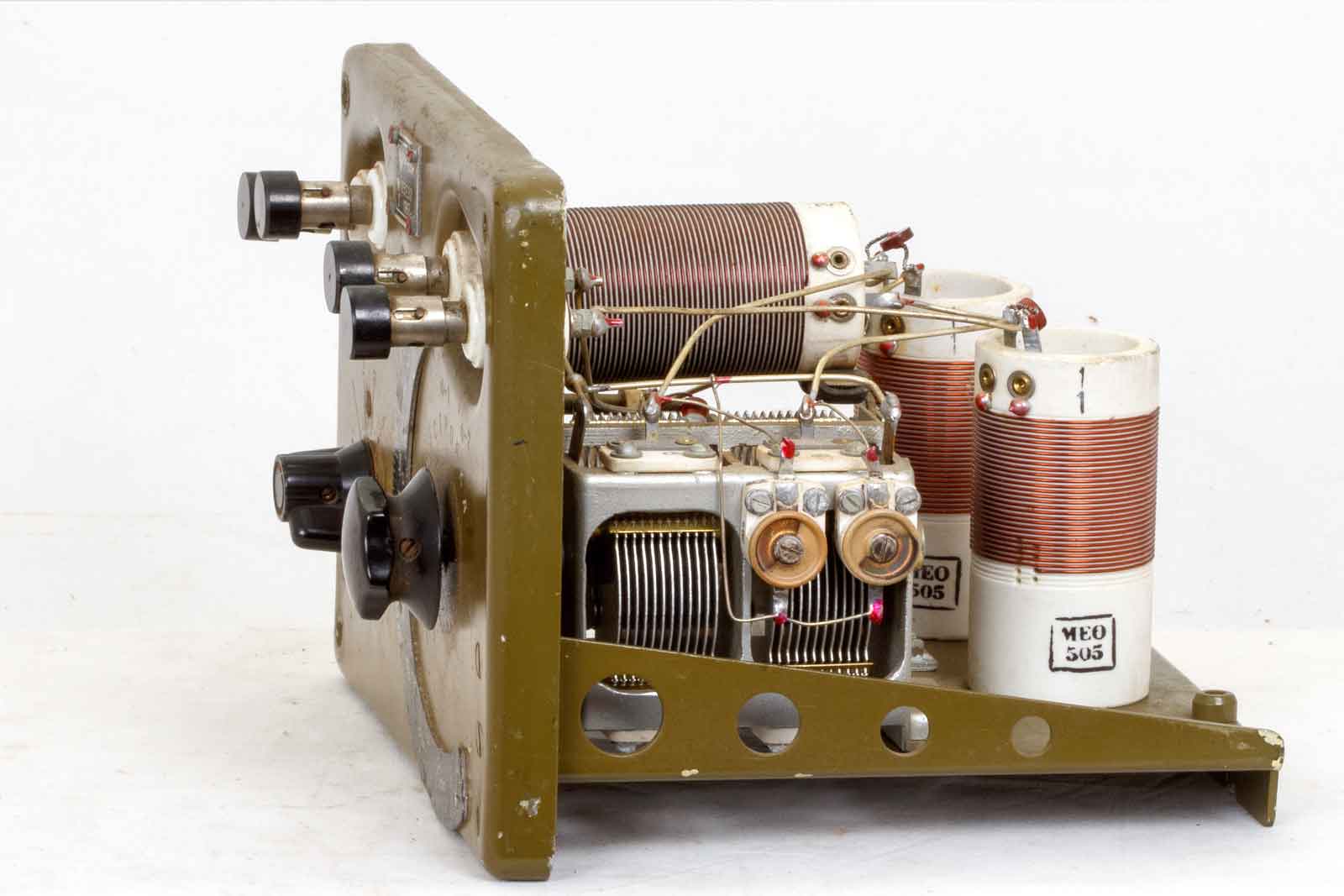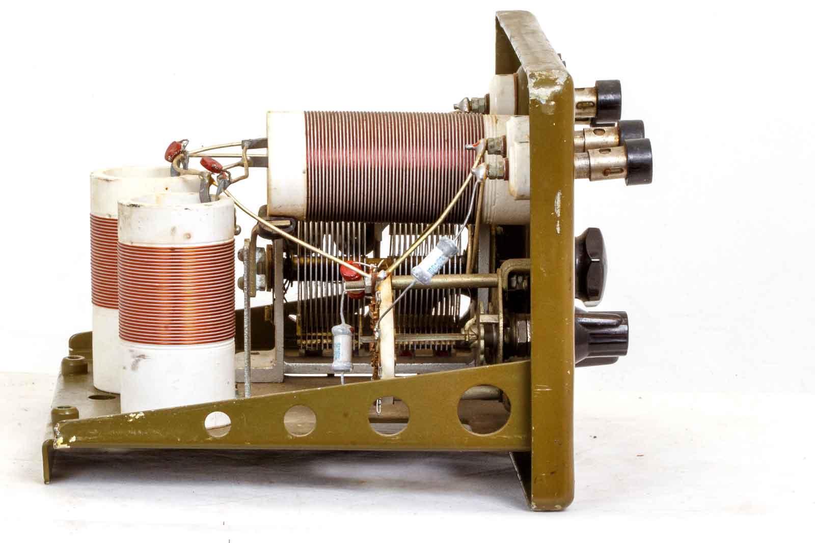 Aan deze kant is de tweevoudige afstemcondensator te zien, 2 x 1000 pF. De twee trimmers dienen voor een gelijktrekking van capaciteitsverschillen van de beide helften van de variabele C.