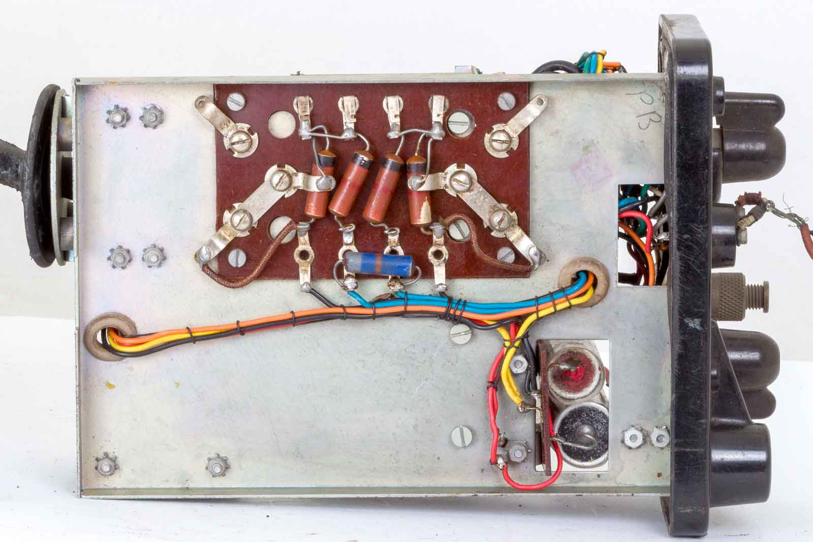 De bedrading aan de onderzijde, duidelijk zijn hier de twee bruggetjes van de verzwakker te zien.
