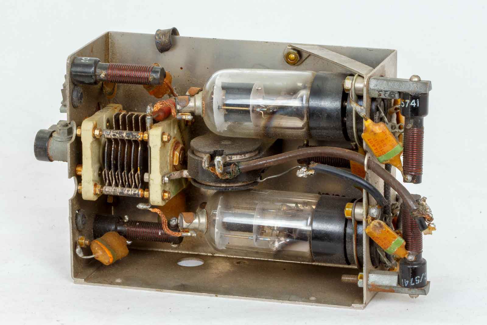 De groene trimmer is ook verwisselbaar, links daarvan de afstemplaat van de resonantiekring, die als een Lecherlijn opgebouwd is. Dit soort ontvangers was heel gevoelig maar produceerde ook veel ruis en HF-straling. Als ontvanger werkte hij tegelijker tijd als zender.
