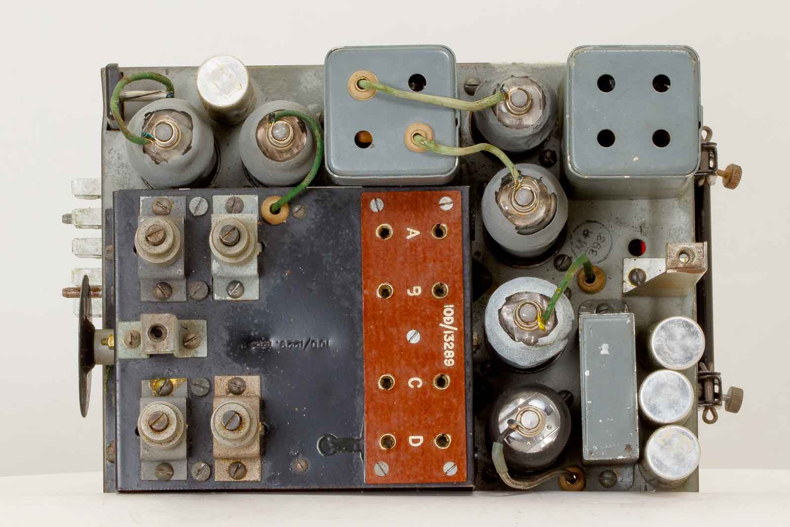 De vier mooie rolspoelen en de kanaalkeuze-schijf met uitsparing voor de aandrijving vanaf de mounting. De voorste buis is de krachtbron voor het HF-zendersignaal. De kristal-oscillator is een VR-91 (EF50), de PA-tetrode is een VT-501 en de modulator is een VT-52.