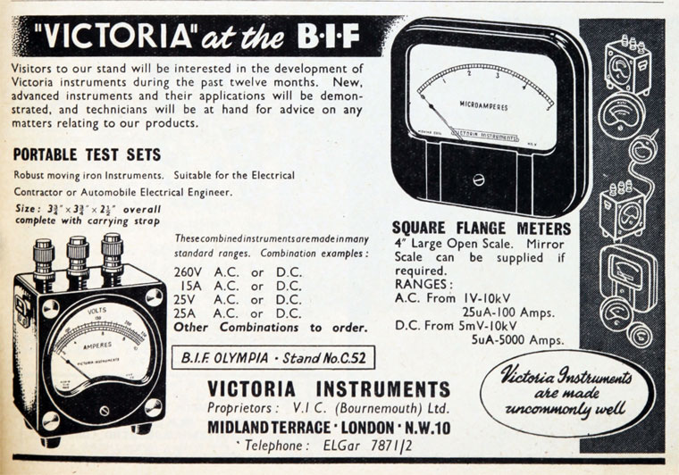 Een advertentie uit 1949 toen het bedrijf nog bestond. Links onder een soortgelijk kastje als het "Instrument Testing No.1".