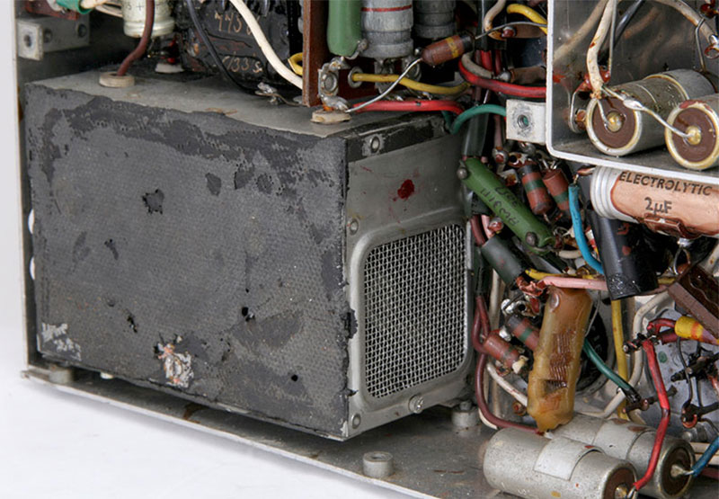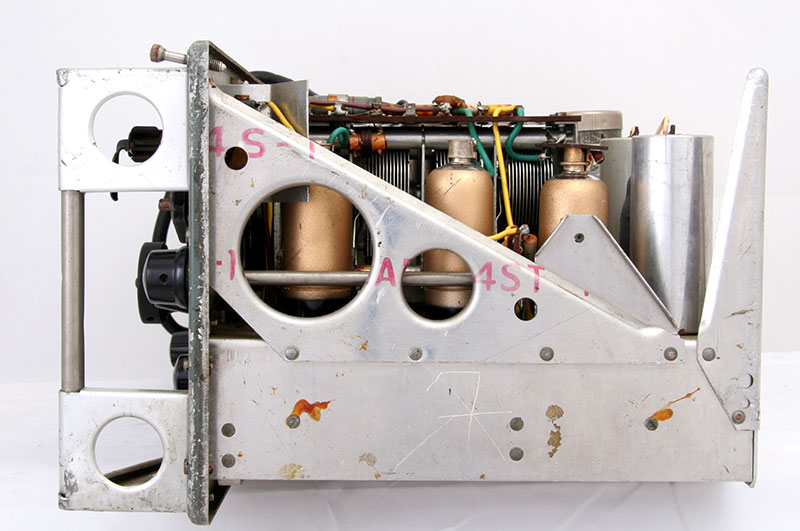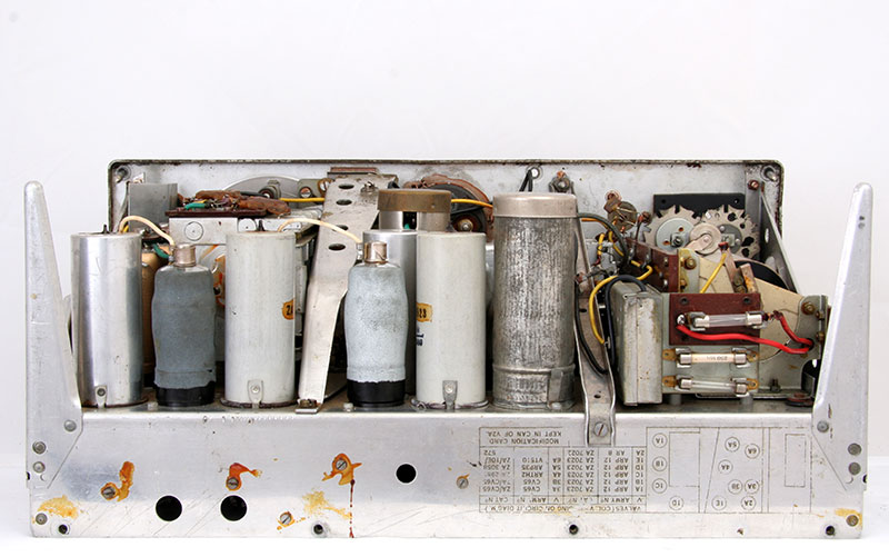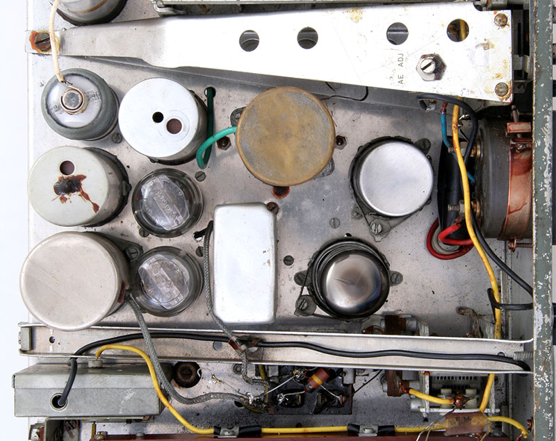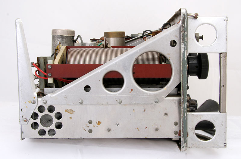 De linkerkant met blik op de rolspoel. De 9 gaten, links onder, zijn voor de koeling van de rotary-transformer, aangezien de fan direkt tegen de buitenkast stond te blazen, deed de koeling nauwelijks wat. Het resultaat was ook de de rotary-transformers bij bosjes uitvielen. In latere versies werd het ding ook vervangen door een transistor-omvormer. Een teken dat de set nog heel lang gebruikt is.