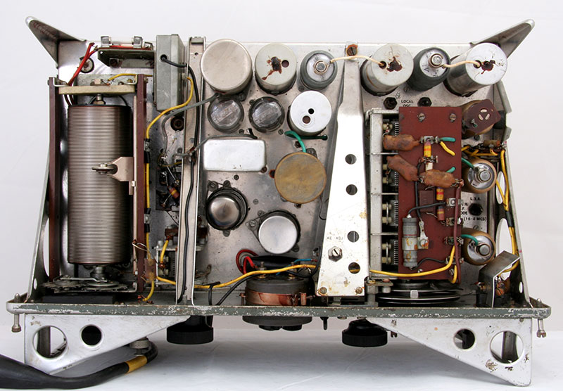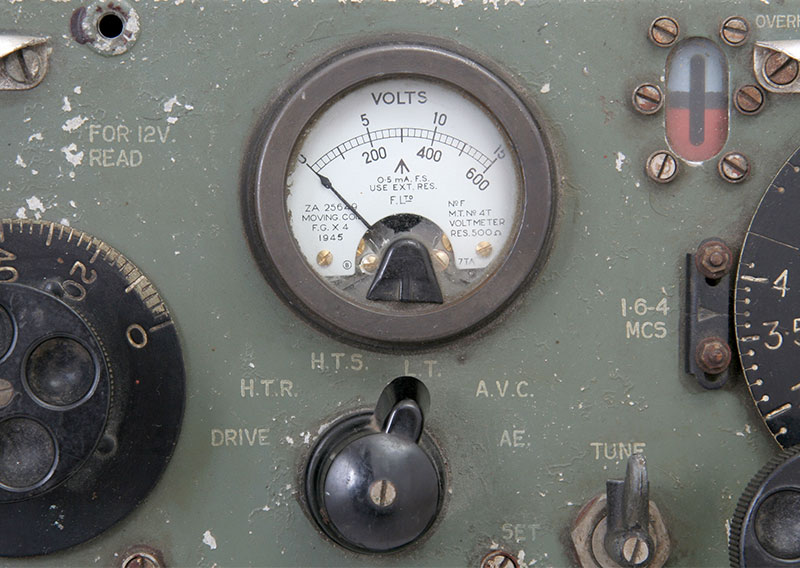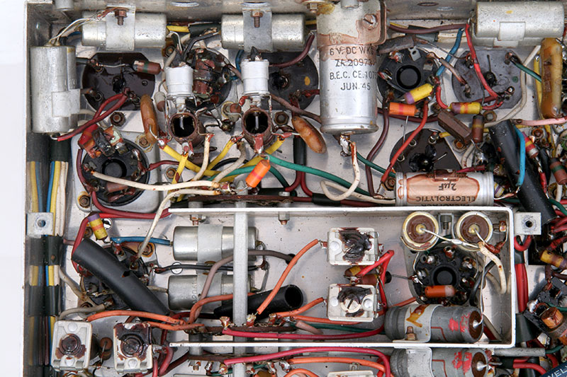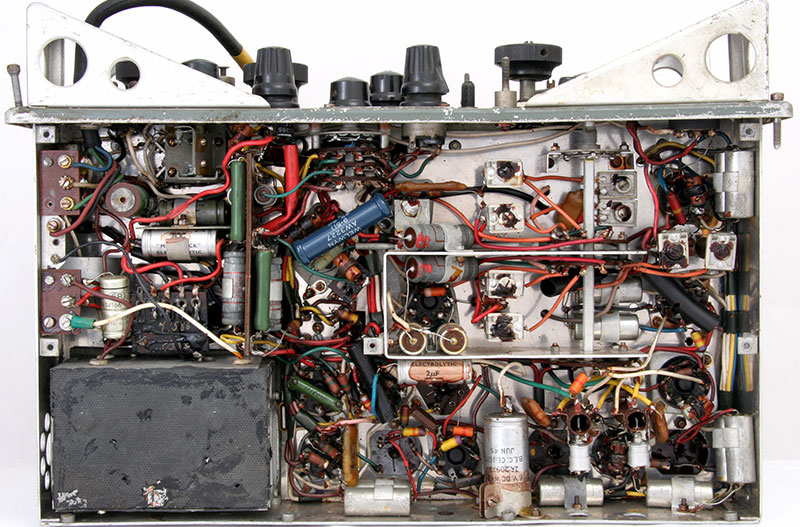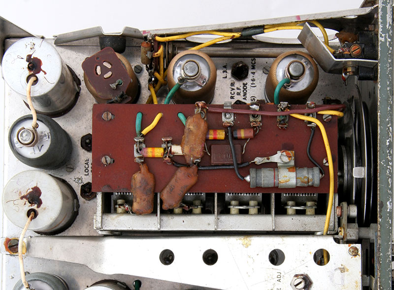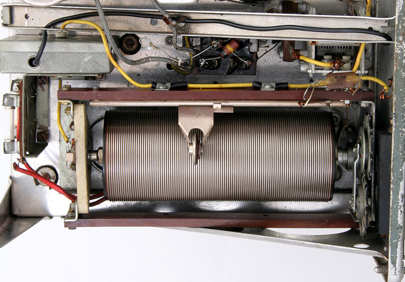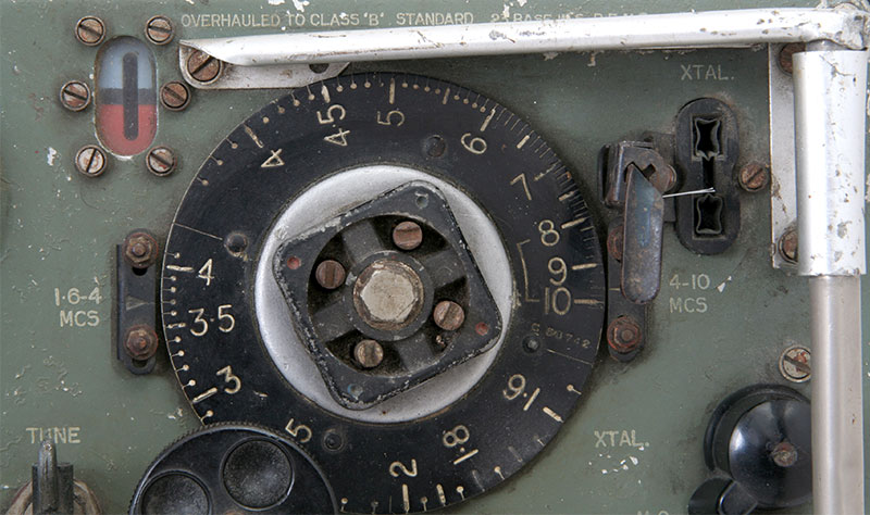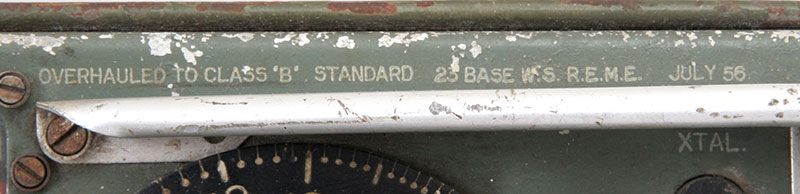 De afstemschaal van zowel ontvanger als zender. Rechts boven is ook nog een kristal te zien. Het moest 460 kHz boven de werk- frequentie zitten. Ook bij deze radio werd het befaamde "Flick-system" toegepast.