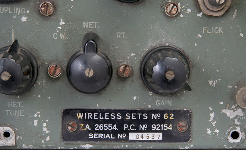 De Wireless Set No. 62 met serienummer 04537, een set die tijdens de tweede wereldoorlog gebouwd is. Er is ook geen toevoeging van MK.I of iets dergelijks. Dit zal dus een MK I zijn. Later werden de vroege sets, door allerlei mechanische tekortkomingen, omgebouwd naar de MK II versie. Dit exemplaar werd in 1956 nog eens totaal gerenoveerd.