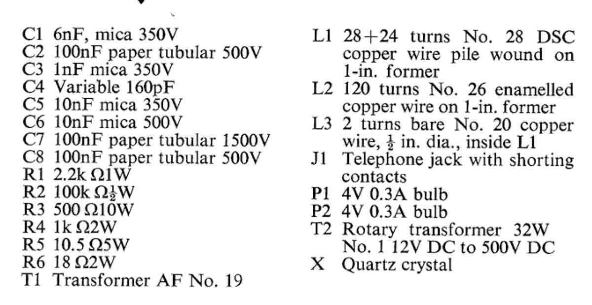 De zender is een simpele, kristal gestuurde oscillator met de beam-tetrode 807 (VT100). De modulatorbuis is een 6J5G. De gloeidraden zijn in serie geschakeld en aangezien de 6J5 wat minder stroom verbruikt dan de 807 is er een weerstand over de gloeidraden van de triode geplaatst. Dezr 6J5 is eigenlijk een soort variabele weerstand die aan het schermrooster van de 807 verbonden is. De buis oscilleert op een frequentie van ca 400 Hz door meekoppeling van het anodesignaal naar het signaalrooster. Door de kathodeweerstand wordt het rooster nog een beetje negatief gemaakt zodat de toon er niet al te belabberd uit komt.