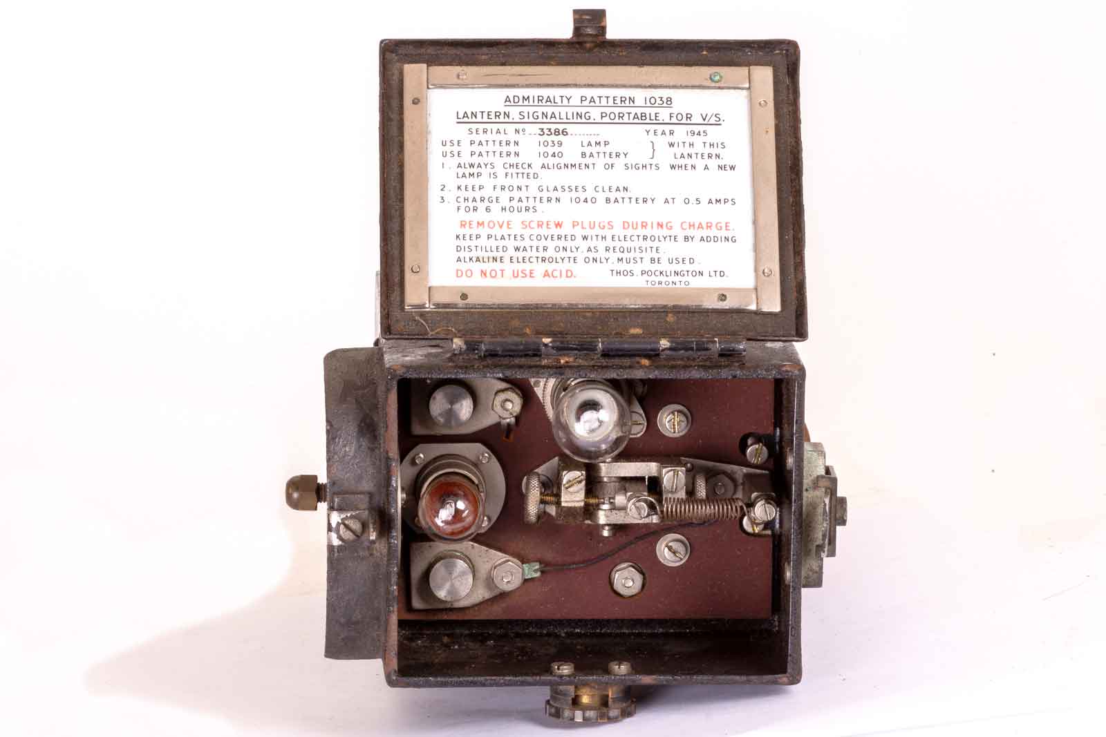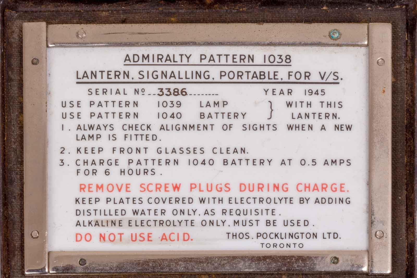Dit is het manual, gemonteerd in het deksel. Dan kun je ook niet zo gemakkelijk kwijt raken. Aan de binnenkant van het deksel staat: "Admiralty Pattern 1038. Lantern Signalling Portable. For V/S.(Visual Signalling), Year 1945. Lamp Pattern 1039. Battery Pattern 1040".