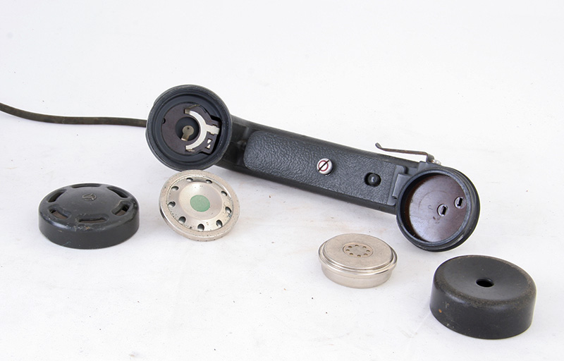 Het microfoonkapsel is van iets met een K, dat zou Krone kunnen zijn.Het moet eigenlijk een 1,5 Volt exemplaar met rode punt zijn en geen groene. De telefoon-ontvanger is van de firma Autophon, ook Zwitsers. Het type is TK398 met een impedantie van 130 Ohm.