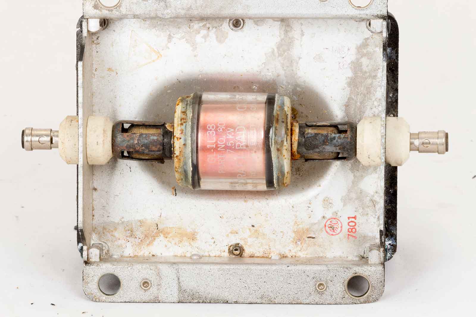 De capaciteit is 50 pF en de doorslagspanning 7,5 kiloVolt. Aangezien dit een vacuum-condensator is, zal er wel geen interne waterschade zijn.