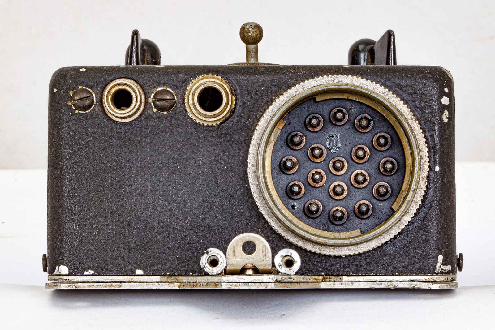 Links de microfoonsocket en rechts daar van de seinsleutel ingang. Verder de veelpolige connector voor de verbinding met de modulator-unit.