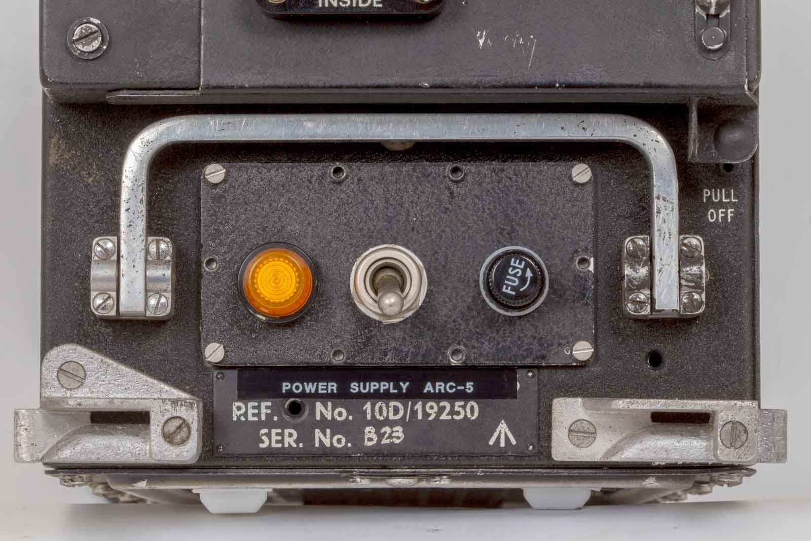 De kreet IFF-receiver type.... heb ik beplakt met een andere tekst. Ref Nr. blijft, dat staat wel interessant. Verder een aan/uit-schakelaar met pilot-lamp en ook maar een zekering, je weet maar nooit.