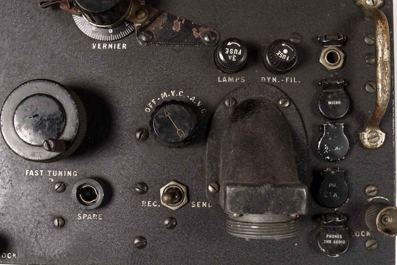 Dan van links naar rechts de bereikschakelaar, het type-plaatje, de grove afstemming, dan de keuzeschakelaar aan/uit, AVC en MVC. De volumeregelaar bestaat uit twee gekoppelde potmeters, de ene voor LF-regeling en de andere voor de MVC-regeling. Dan komt de aansluiting van een grote plug die met een kabel in verbinding staat met een zender die tevens de voedingsspanning verzorgt bij de DC-gevoede types. De hele rits met klepjes afgedekte aansluitingen zijn van boven naar beneden: Seinsleutel, Microfoon, Luidspreker (LS-3) en twee aansluitingen voor hoofd-telefoons (HS-30). Verder zijn er nog een drietal zekeringhouders waarvan er een als reserve-zekeringhouder wordt gebruikt.
