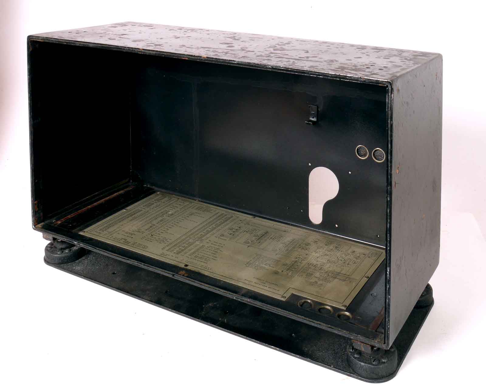 De lege kast op mounting. Het vreemd gevormde gat achter is voor de AC-uitvoering. De net-aansluiting en de aan/uit-schakelaar zijn hierdoor bereikbaar.